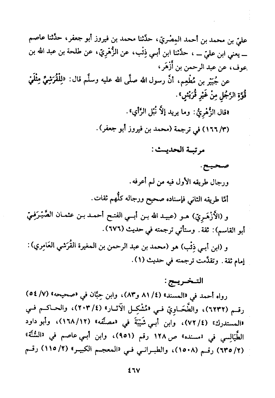 عليّ بن محمد بن أحمد المِصْريّ، حدَّثنا محمد بن فيروز أبو جعفر، حدَّثنا عاصم -يعني ابن عليّ-، حدَّثنا ابن أبي ذِئْب، عن الزُّهْرِيّ، عن طلحة بن عبد اللَّه بن عوف، عن عبد الرحمن بن أَزْهَر،