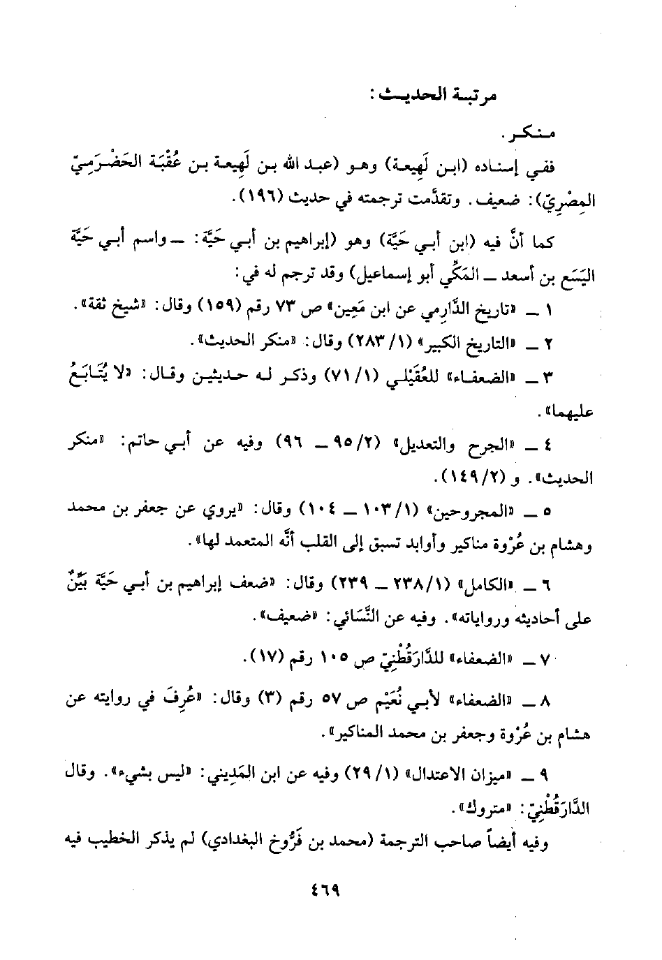 ٦ - "الكامل" (١/ ٢٣٨ - ٢٣٩) وقال: "ضعف إبراهيم بن أبي حَيَّة بَيِّنٌ على أحاديثه ورواياته". وفيه عن النَّسَائي: "ضعيف".