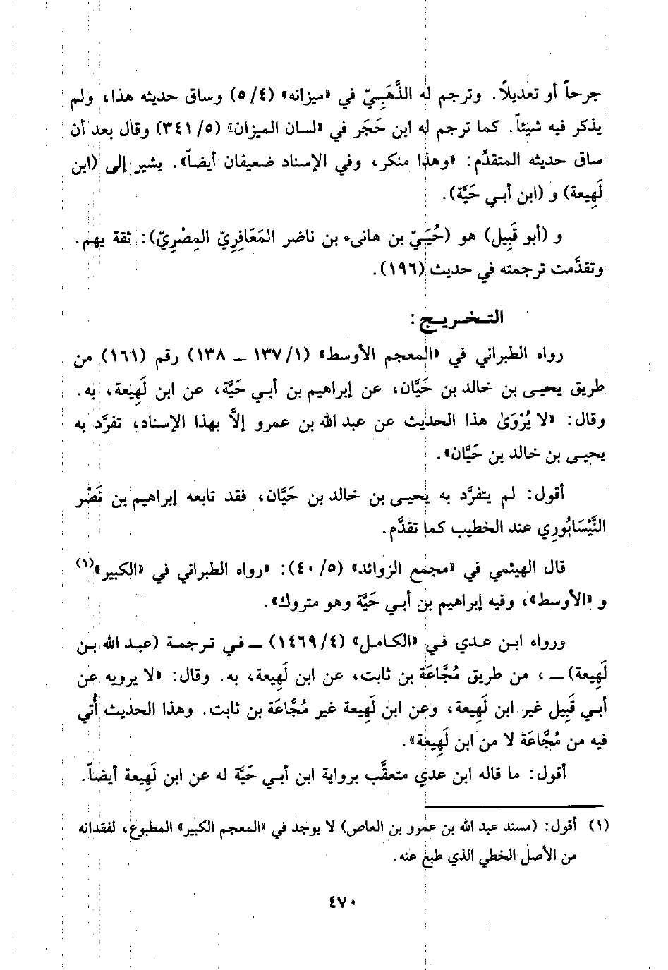رواه الطبراني في "المعجم الأوسط" (١/ ١٣٧ - ١٣٨) رقم (١٦١) من طريق يحيى بن خالد بن حَيَّان، عن إبراهيم بن أبي حَيَّة، عن ابن لَهِيعة، به. وقال: "لا يُرْوَى هذا الحديث عن عبد اللَّه بن عمرو إلَّا بهذا الإسناد، تفرَّد به يحيى بن خالد بن حَيَّان".