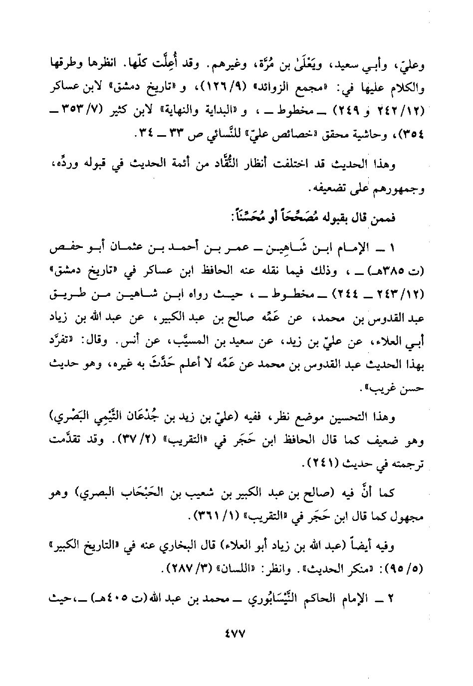 ١ - الإمام ابن شَاهِين -عمر بن أحمد بن عثمان أبو حفص (ت ٣٨٥) -، وذلك فيما نقله عنه الحافظ ابن عساكر في "تاريخ دمشق" (١٢/ ٢٤٣ - ٢٤٤) -مخطوط-، حيث رواه ابن شاهين من طريق عبد القدوس بن محمد، عن عَمِّه صالح بن عبد الكبير، عن عبد اللَّه بن زياد أبي العلاء، عن عليّ بن زيد، عن سعيد بن المسيَّب، عن أنس. وقال: "تفرَّد بهذا الحديث عبد القدوس بن محمد عن عَمِّه لا أعلم حَدَّثَ به غيره، وهو حديث حسن غريب".