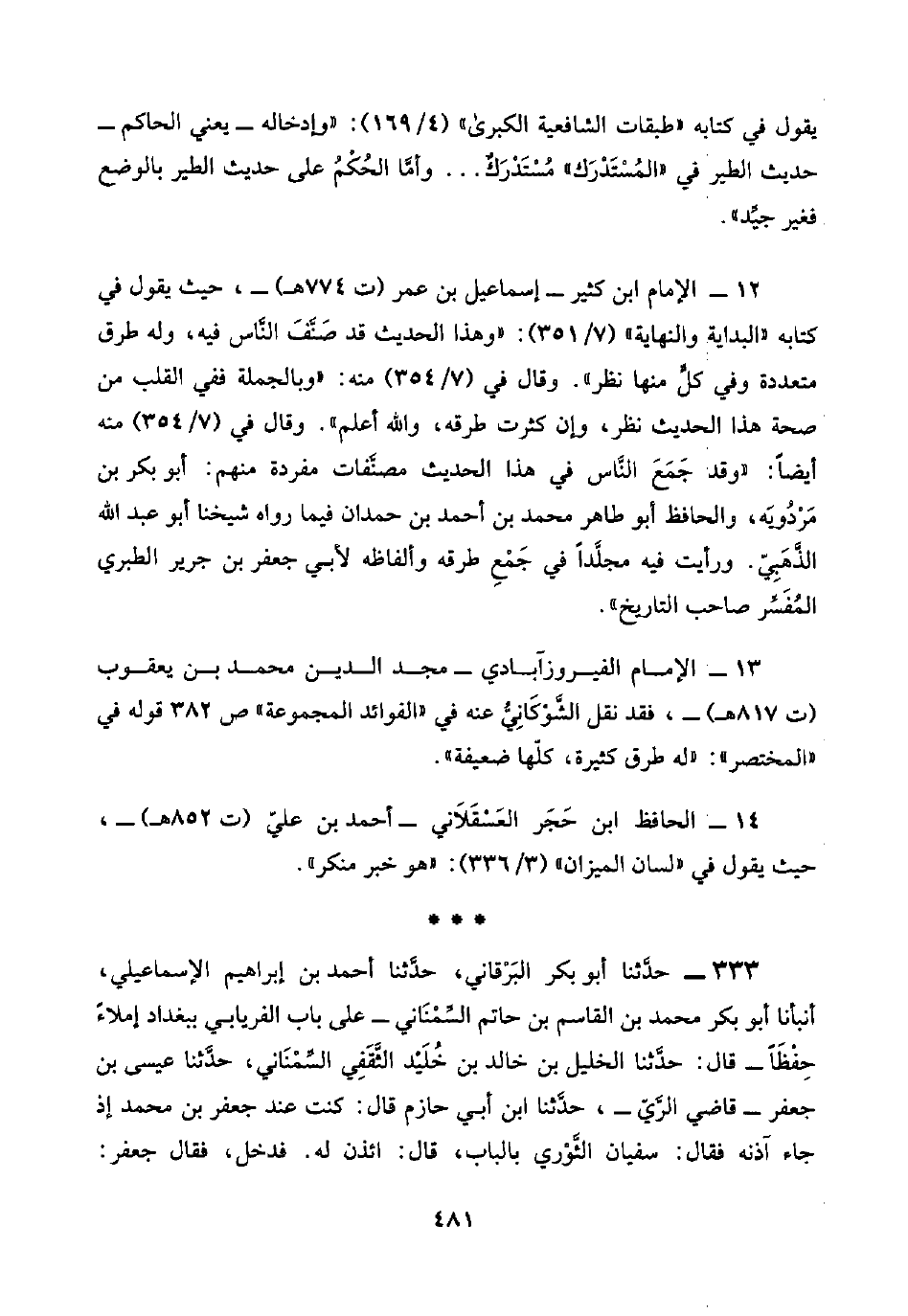 ٣٣٣ - حدَّثنا أبو بكر البَرْقاني، حدَّثنا أحمد بن إبراهيم الإسماعيلي، أنبأنا أبو بكر محمد بن القاسم بن حاتم السِّمْنَاني -على باب الفريابي ببغداد إملاءً حِفْظًا- قال: حدَّثنا الخليل بن خالد بن خُلَيْد الثَّقَفِي السِّمْنَاني، حدَّثنا عيسى بن جعفر -قاضي الرَّيّ-، حدَّثنا ابن أبي حازم قال: كنت عند جعفر بن محمد إذ جاء آذنه فقال: سفيان الثَّوْري بالباب، قال: ائذن له. فدخل، فقال جعفر: