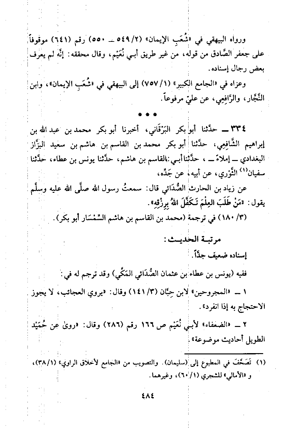 ٣٣٤ - حدَّثنا أبو بكر البَرْقَاني، أخبرنا أبو بكر محمد بن عبد اللَّه بن إبراهيم الشَّافِعِي، حدَّثنا أبو بكر محمد بن القاسم بن هاشم بن سعيد البزَّاز البغدادي -إملاءً-، حدَّثنا أبي: القاسم بن هاشم، حدَّثنا يونس بن عطاء، حدَّثنا سفيان (¬١) الثَّوْري، عن أبيه، عن جَدِّه،