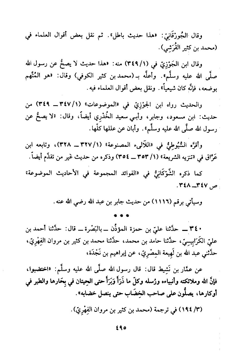 وقال ابن الجَوْزِيّ في (١/ ٣٤٩) منه: "هذا حديث لا يصحُّ عن رسول اللَّه صلَّى اللَّه عليه وسلَّم". وأعلَّه بـ (محمد بن كثير الكوفي) وقال: "هو المُتَّهم بوضعه، فإنَّه كان شيعيًا". ونقل بعض أقوال العلماء فيه.