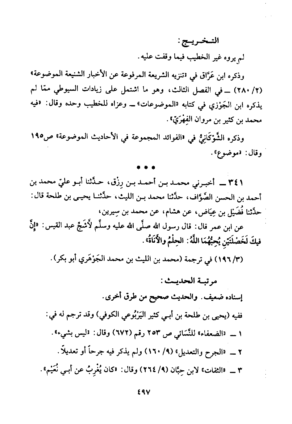 ٣٤١ - أخبرني محمد بن أحمد بن رِزْق، حدَّثنا أبو عليّ محمد بن أحمد بن الحسن الصَّوَّاف، حدَّثنا محمد بن الليث، حدَّثنا يحيى بن طلحة قال: حدَّثنا فُضَيْل بن عِيَاض، عن هشام، عن محمد بن سِيرين،
