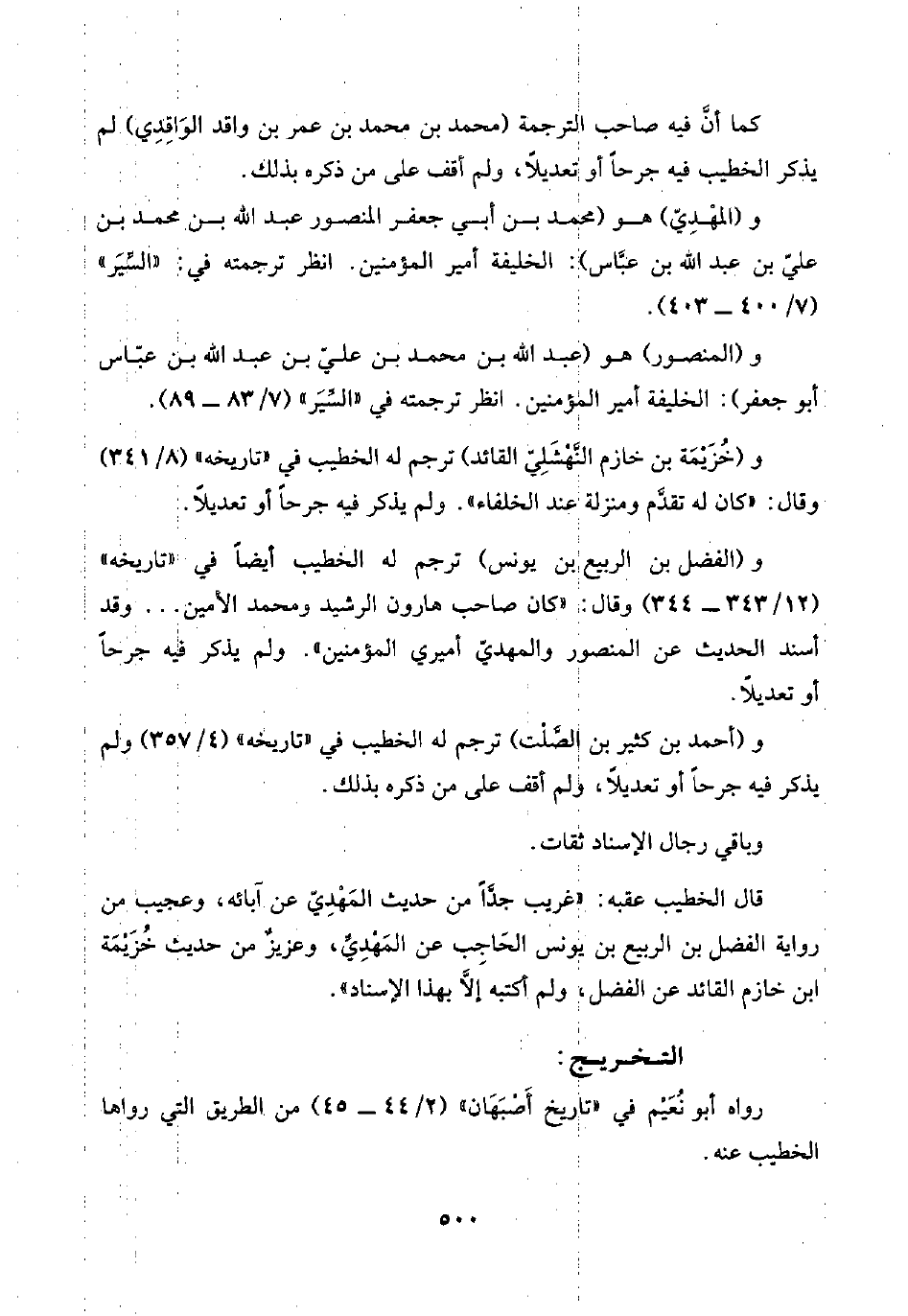قال الخطيب عقبه: "غريب جدًّا من حديث المَهْدِيّ عن آبائه، وعجيب من رواية الفضل بن الربيع بن يونس الحَاجِب عن المَهْدِيِّ، وعزيزٌ من حديث خُزَيْمَة ابن خازم القائد عن الفضل، ولم أكتبه إلَّا بهذا الإسناد".