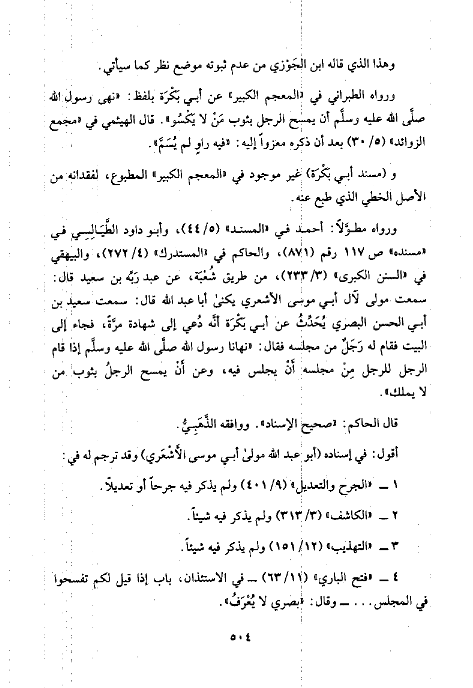 ورواه الطبراني في "المعجم الكبير" عن أبي بَكْرَة بلفظ: "نهى رسول اللَّه صلَّى اللَّه عليه وسلَّم أن يمسح الرجل بثوب مَنْ لا يَكْسُو". قال الهيثمي في "مجمع الزوائد" (٥/ ٣٠) بعد أن ذكره معزوًا إليه: "فيه راوٍ لم يُسَمَّ".