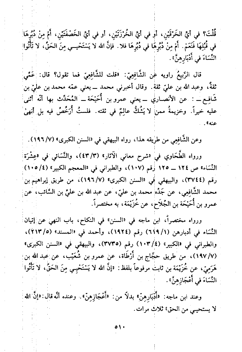 قُلْتَ؟ في أيِّ الخَرْقَيْنِ، أو في أيِّ الخُرْزَتَيْنِ، أو في أيِّ الخَصْفَتَيْنِ، أَمْ مِنْ دُبُرِهَا في قُبُلِهَا فَنَعَمْ. أَمْ مِنْ دُبُرِهَا في دُبُرِهَا فلا. فإنَّ اللَّه لا يَسْتَحْيي مِنَ الحَقِّ، لا تَأْتُوا النِّسَاءَ في أَدْبَارِهِنَّ".