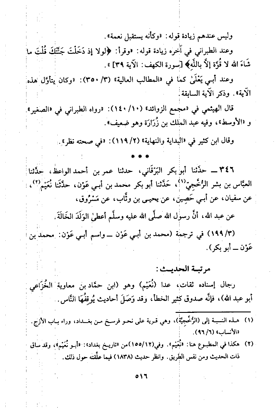 ٣٤٦ - حدَّثنا أبو بكر البَرْقَاني، حدَّثنا عمر بن أحمد الواعظ، حدَّثنا العبَاس بن بشر الرُّخَّجِيّ (¬١)، حدَّثنا أبو بكر محمد بن أبي عَوْن، حدَّثَنا نُعَيْم (¬٢)، عن سفيان، عن أبي حَصِين، عن يحيى بن وثَّاب، عن مَسْرُوق،