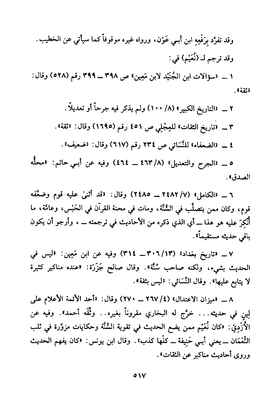 ٨ - "ميزان الاعتدال" (٤/ ٢٦٧ - ٢٨٠) وقال: "أحد الأئمة الأعلام على لِينٍ في حديثه. . . خرَّج له البخاري مقرونًا بغيره. . وثَّقَه أحمد". وفيه عن الأَزْدِيّ: "كان نُعَيْم ممن يضع الحديث في تقوية السُّنَّة وحكايات مزوَّرة في ثلب النُّعْمَان -يعني أبي حَنِيفة- كلّها كذب". وقال ابن يونس: "كان يفهم الحديث وروى أحاديث مناكير عن الثقات".