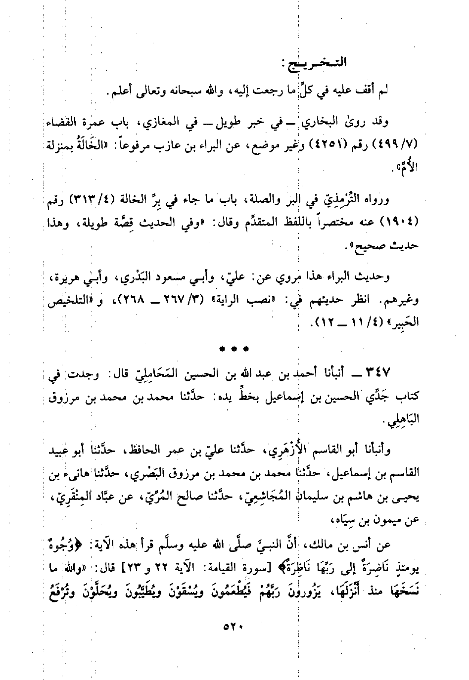 ٣٤٧ - أنبأنا أحمد بن عبد اللَّه بن الحسين المَحَامِلِيّ قال: وجدت في كتاب جَدِّي الحسين بن إسماعيل بخطِّ يده: حدَّثنا محمد بن محمد بن مرزوق البَاهِلِي.