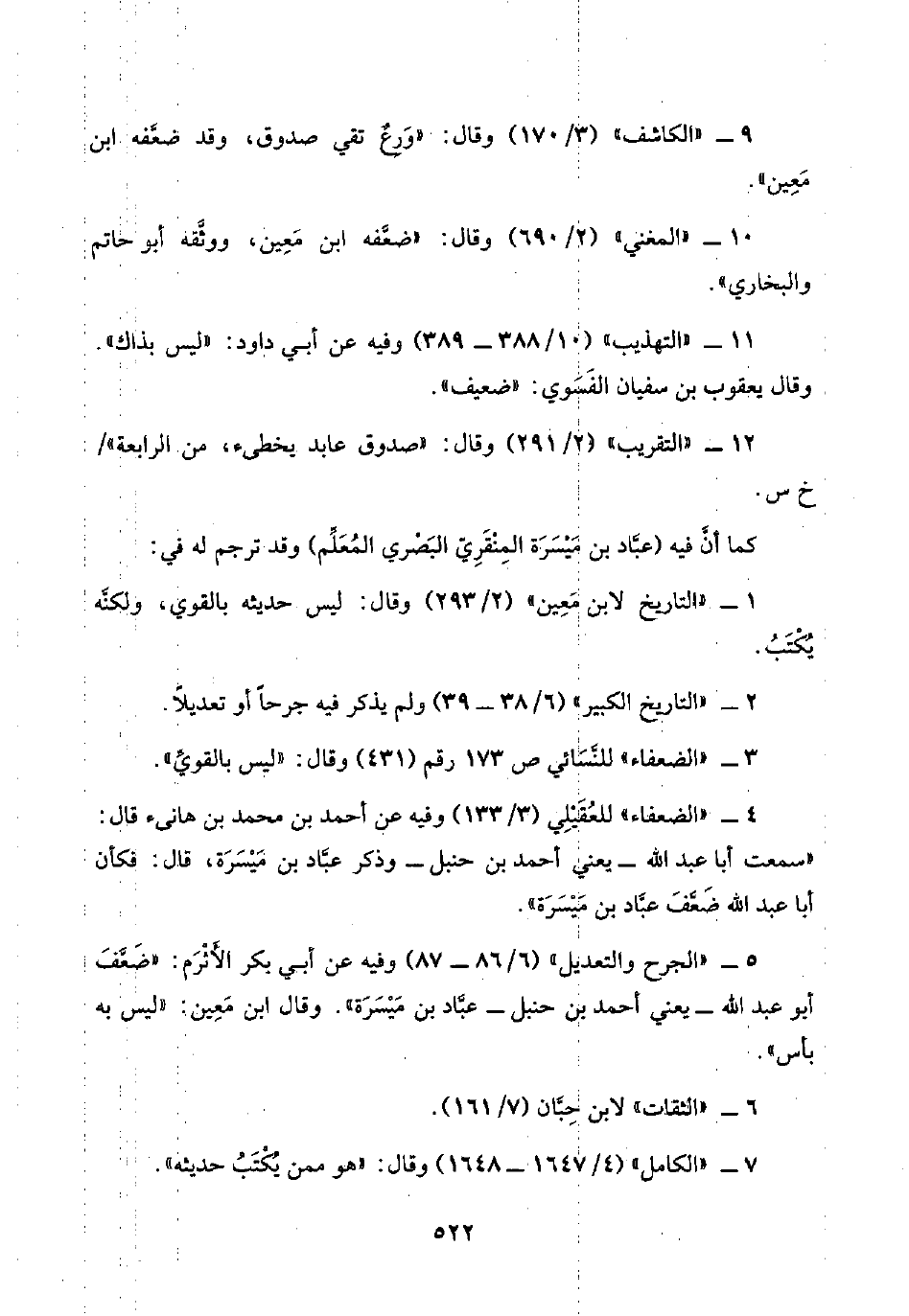 ٥ - "الجرح والتعديل" (٦/ ٨٦ - ٨٧) وفيه عن أبي بكر الأَثْرَم: "ضَعَّفَ أبو عبد اللَّه -يعني أحمد بن حنبل- عبّاد بن مَيْسَرَة". وقال ابن مَعِين: "ليس به بأس".