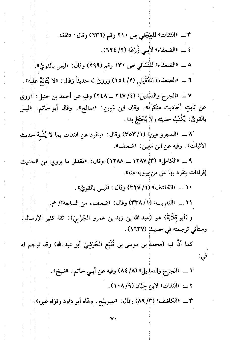 ٧ - "الجرح والتعديل" (٤/ ٢٤٧ - ٢٤٨) وفيه عن أحمد بن حنبل: "روى عن ثابتٍ أحاديث منكرة". وقال ابن مَعِين: "صالح". وقال أبو حاتم: "ليس بالقويِّ، يُكْتَبُ حديثه ولا يُحْتَجُّ به".
