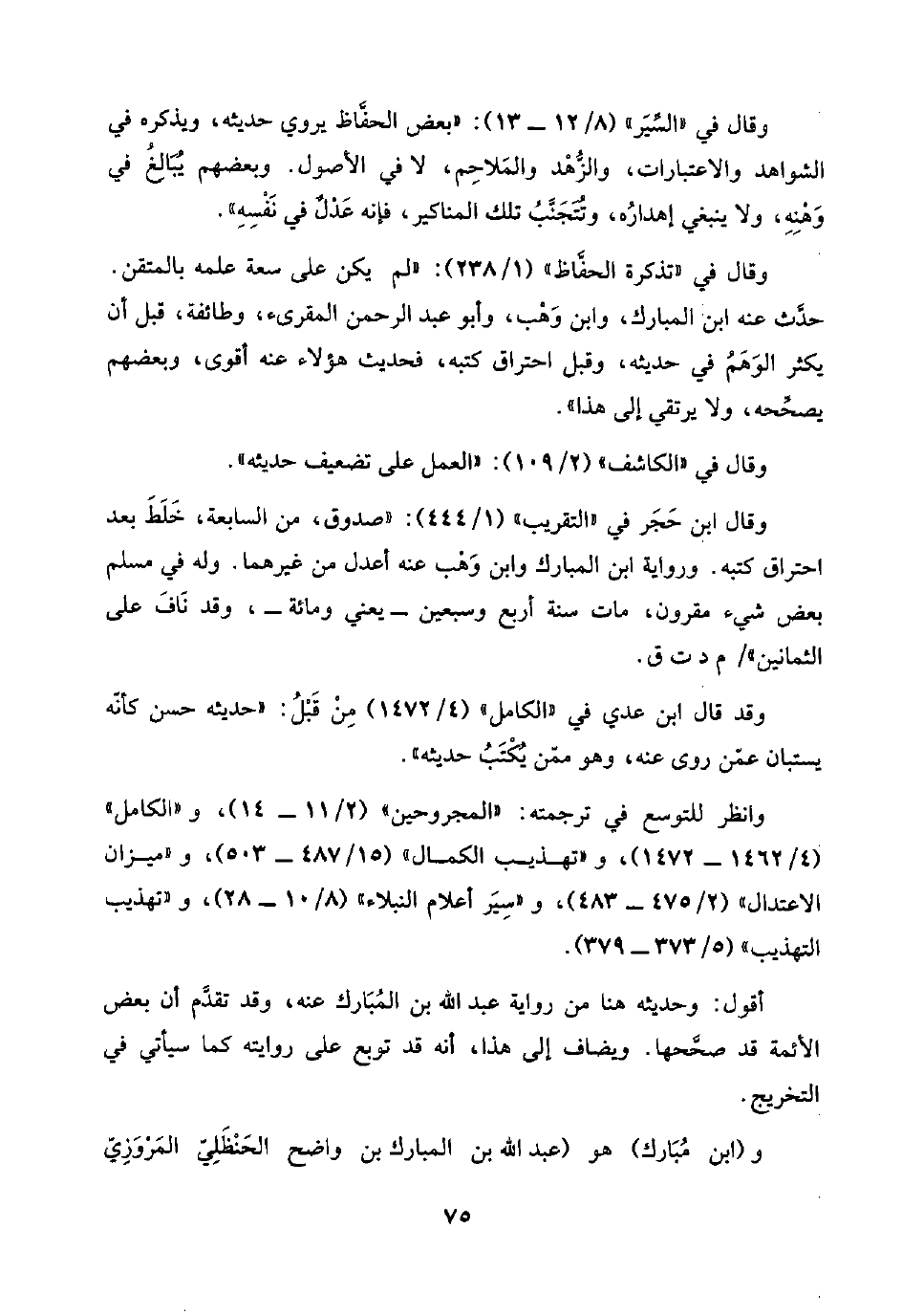 وقال في "تذكرة الحفَّاظ" (١/ ٢٣٨): "لم يكن على سعة علمه بالمتقن. حدَّث عنه ابن المبارك، وابن وَهْب، وأبو عبد الرحمن المقرئ، وطائفة، قبل أن يكثر الوَهَمُ في حديثه، وقبل احتراق كتبه، فحديث هؤلاء عنه أقوى، وبعضهم يصحِّحه، ولا يرتقي إلى هذا".