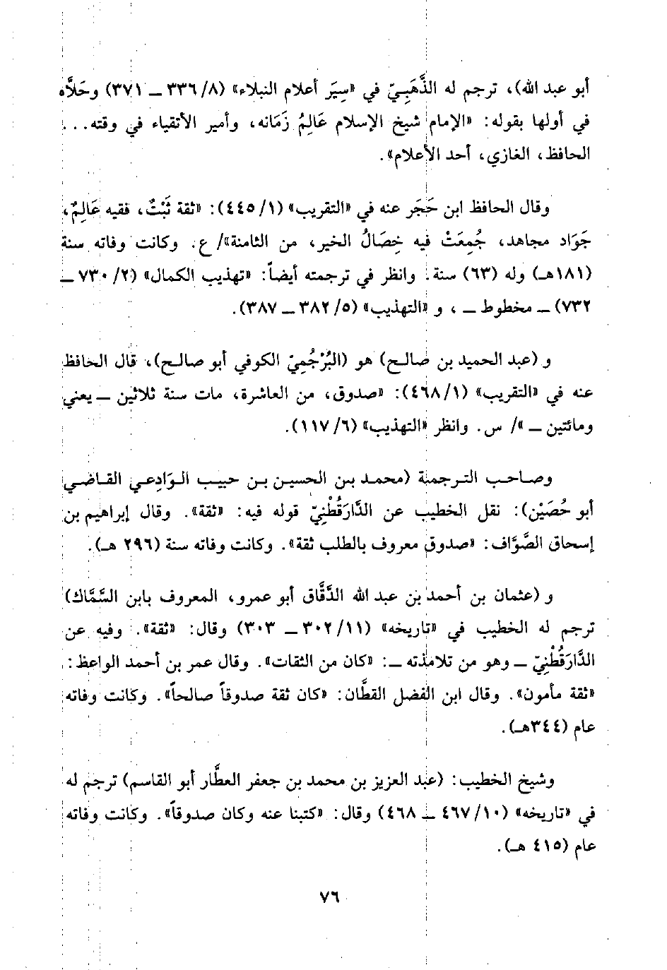 وصاحب الترجمة (محمد بن الحسين بن حبيب الوَادِعي القاضي أبو حُصَيْن): نقل الخطيب عن الدَّارَقُطْنِيّ قوله فيه: "ثقة". وقال إبراهيم بن إسحاق الصَّوَّاف: "صدوق معروف بالطلب ثقة". وكانت وفاته سنة (٢٩٦ هـ).