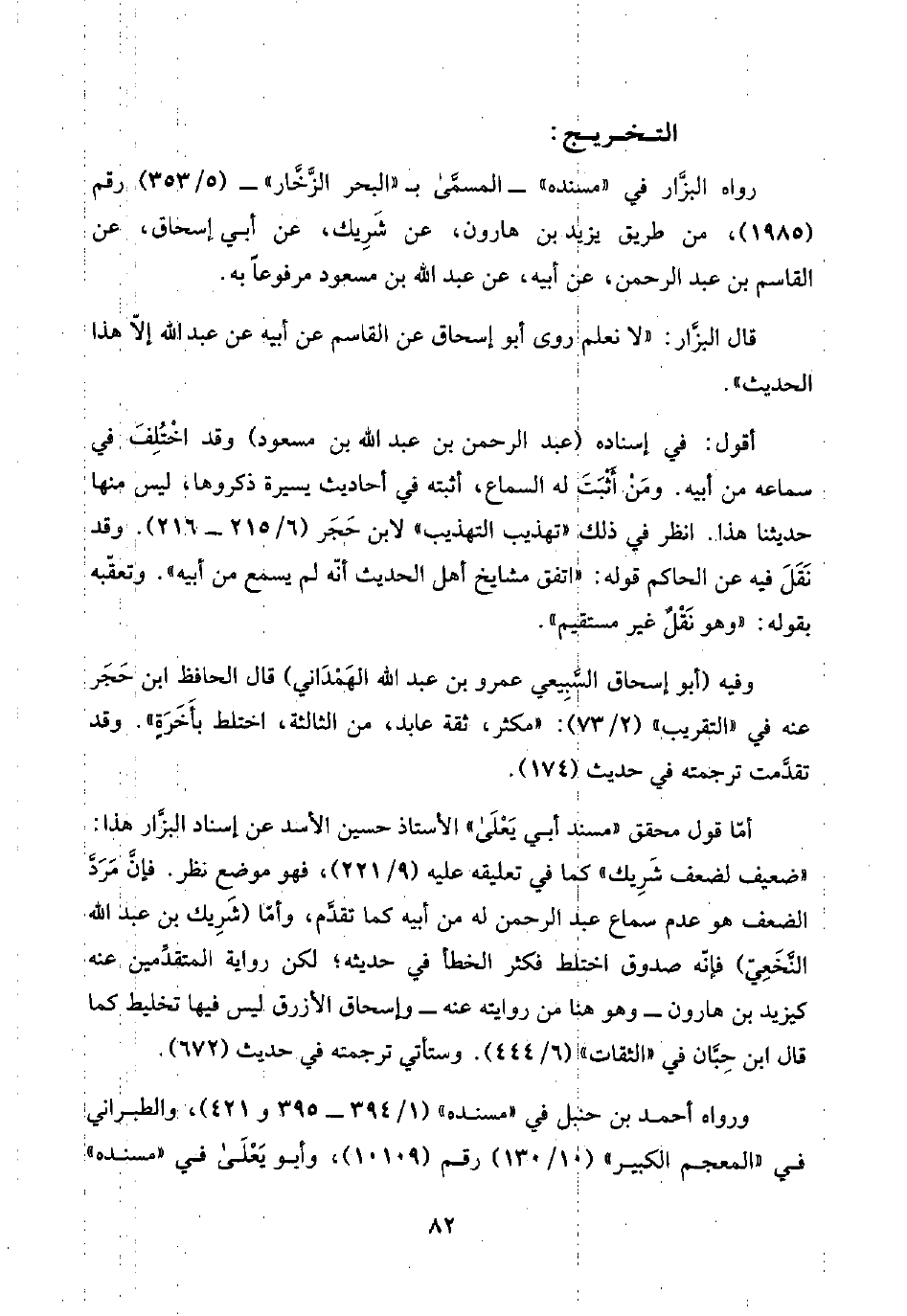 أمّا قول محقق "مسند أبي يَعْلَى" الأستاذ حسين الأسد عن إسناد البزَّار هذا: "ضعيف لضعف شَرِيك" كما في تعليقه عليه (٩/ ٢٢١)، فهو موضع نظر. فإنَّ مَرَدَّ الضعف هو عدم سماع عبد الرحمن له من أبيه كما تقدَّم، وأمّا (شَرِيك بن عبد اللَّه النَّخَعِيّ) فإنّه صدوق اختلط فكثر الخطأ في حديثه؛ لكن رواية المتقدِّمين عنه كيزيد بن هارون -وهو هنا من روايته عنه- وإسحاق الأزرق ليس فيها تخليط كما قال ابن حِبَّان في "الثقات" (٦/ ٤٤٤). وستأتي ترجمته في حديث (٦٧٢).