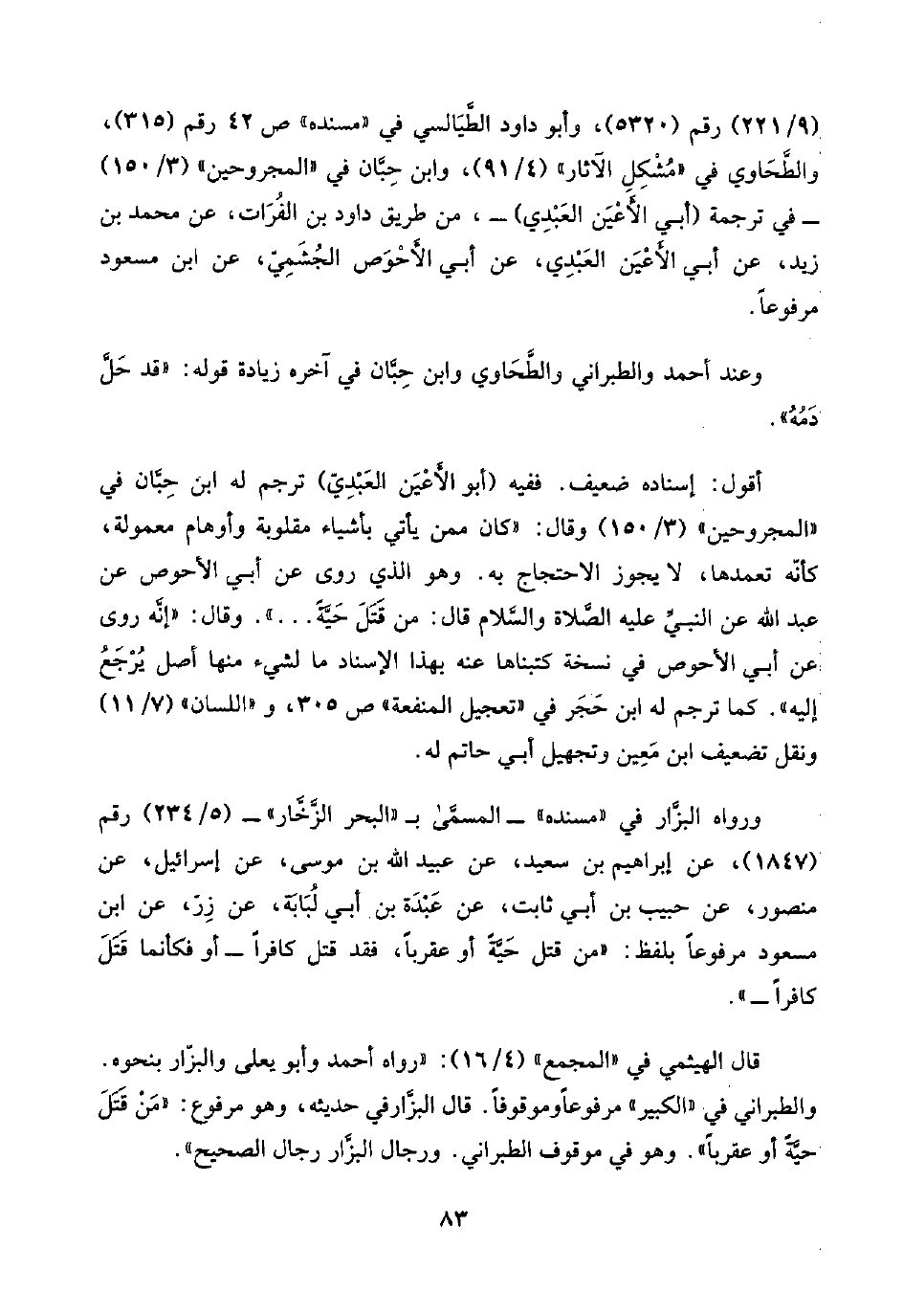 أقول: إسناده ضعيف. ففيه (أبو الأَعْيَن العَبْدِيّ) ترجم له ابن حِبَّان في "المجروحين" (٣/ ١٥٠) وقال: "كان ممن يأتي بأشياء مقلوبة وأوهام معمولة، كأنّه تعمدها، لا يجوز الاحتجاج به. وهو الذي روى عن أبي الأحوص عن عبد اللَّه عن النبيِّ عليه الصلاة والسَّلام قال: من قَتَلَ حَيَّةً. . . " وقال: "إنَّه روى عن أبي الأحوص في نسخة كتبناها عنه بهذا الإسناد ما لشيء منها أصل يُرْجَعُ إليه". كما ترجم له ابن حَجَر في "تعجيل المنفعة" ص ٣٠٥، و"اللسان" (٧/ ١١) ونقل تضعيف ابن مَعِين وتجهيل أبي حاتم له.