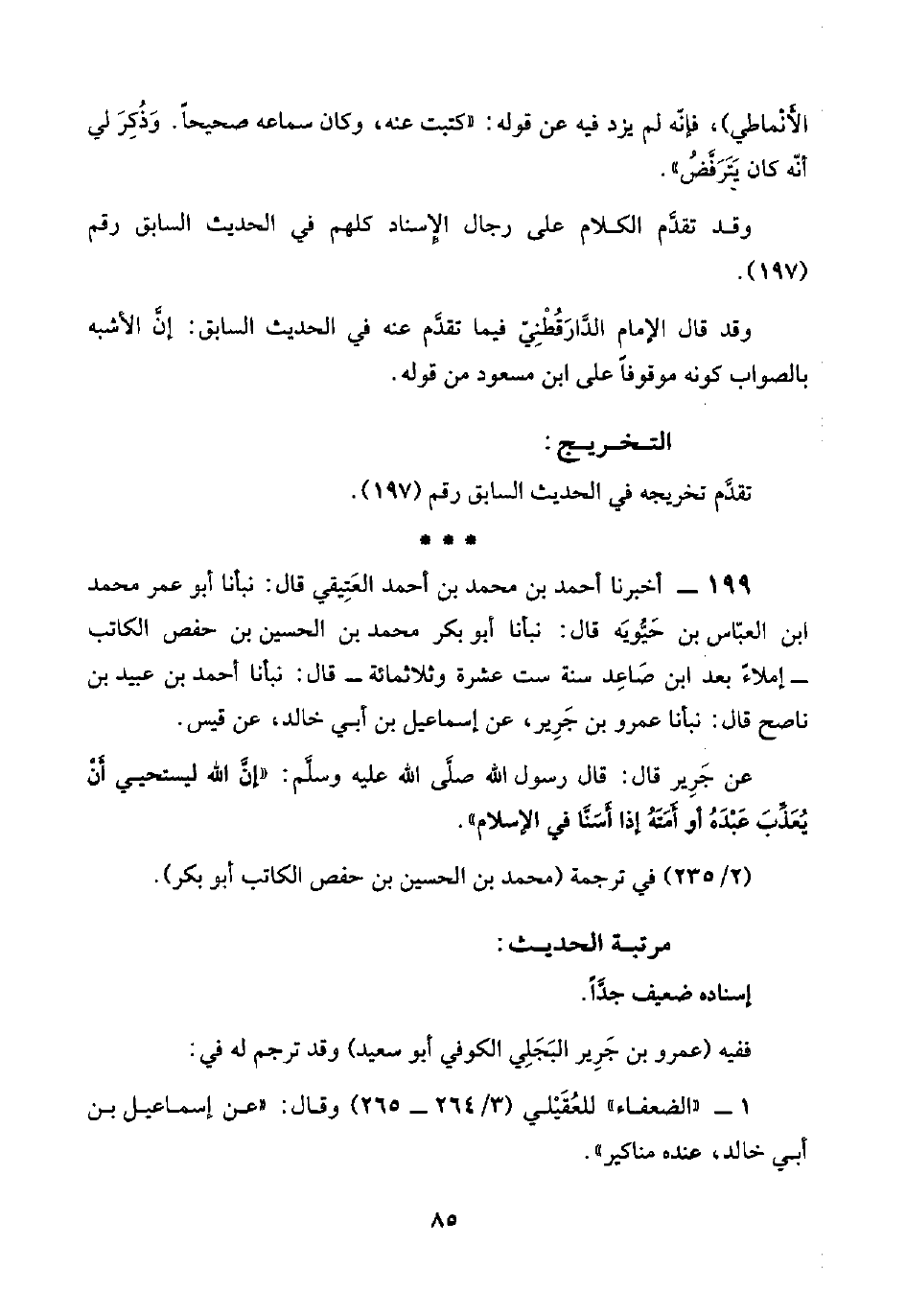 ١٩٩ - أخبرنا أحمد بن محمد بن أحمد العَتِيقي قال: نبأنا أبو عمر محمد ابن العبّاس بن حَيُّويَه قال: نبأنا أبو بكر محمد بن الحسين بن حفص الكاتب -إملاءً بعد ابن صَاعِد سنة ست عشرة وثلاثمائة- قال: نبأنا أحمد بن عبيد بن ناصح قال: نبأنا عمرو بن جَرِير، عن إسماعيل بن أبي خالد، عن قيس.