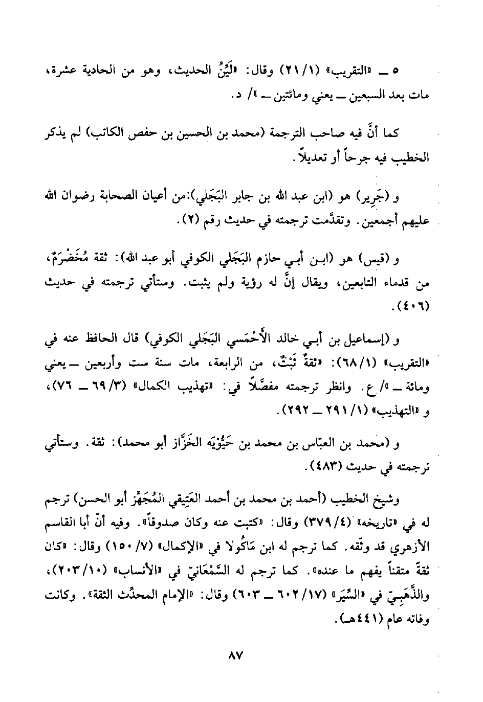 و(إسماعيل بن أبي خالد الأَحْمَسي البَجَلي الكوفي) قال الحافظ عنه في "التقريب" (١/ ٦٨): "ثقةٌ ثَبْثٌ، من الرابعة، مات سنة ست وأربعين -يعني ومائة-"/ ع. وانظر ترجمته مفصَّلًا في: "تهذيب الكمال" (٣/ ٦٩ - ٧٦)، و"التهذيب" (١/ ٢٩١ - ٢٩٢).
