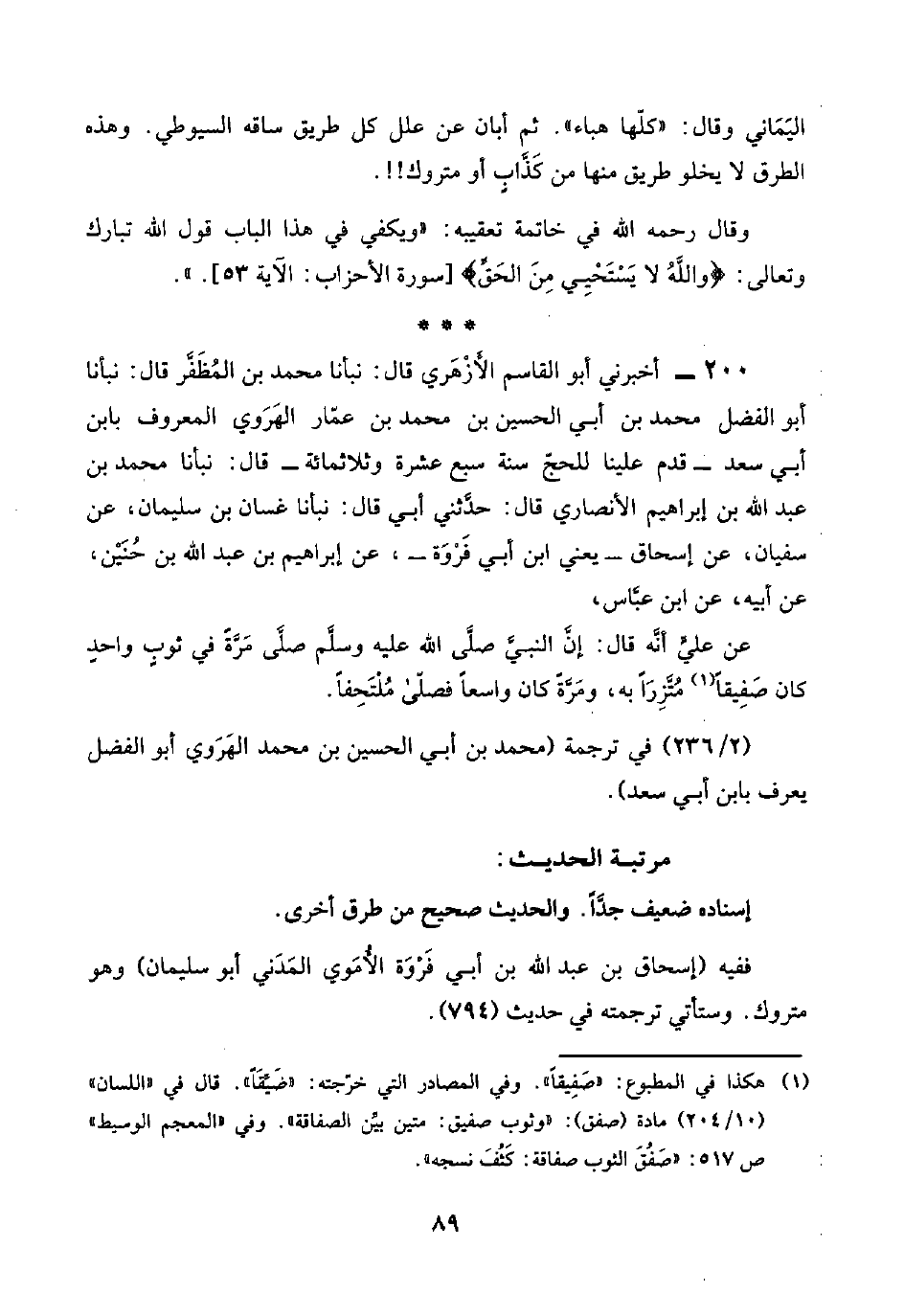 ٢٠٠ - أخبرني أبو القاسم الأَزْهَري قال: نبأنا محمد بن المُظَفَّر قال: نبأنا أبو الفضل محمد بن أبي الحسين بن محمد بن عمّار الهَرَوي المعروف بابن أبي سعد -قدم علينا للحجّ سنة سبع عشرة وثلاثمائة- قال: نبأنا محمد بن عبد اللَّه بن إبراهيم الأنصاري قال: حدَّثني أبي قال: نبأنا غسان بن سليمان، عن سفيان، عن إسحاق -يعني ابن أبي فَرْوَة-، عن إبراهيم بن عبد اللَّه بن حُنَيْن، عن أبيه، عن ابن عبَّاس،