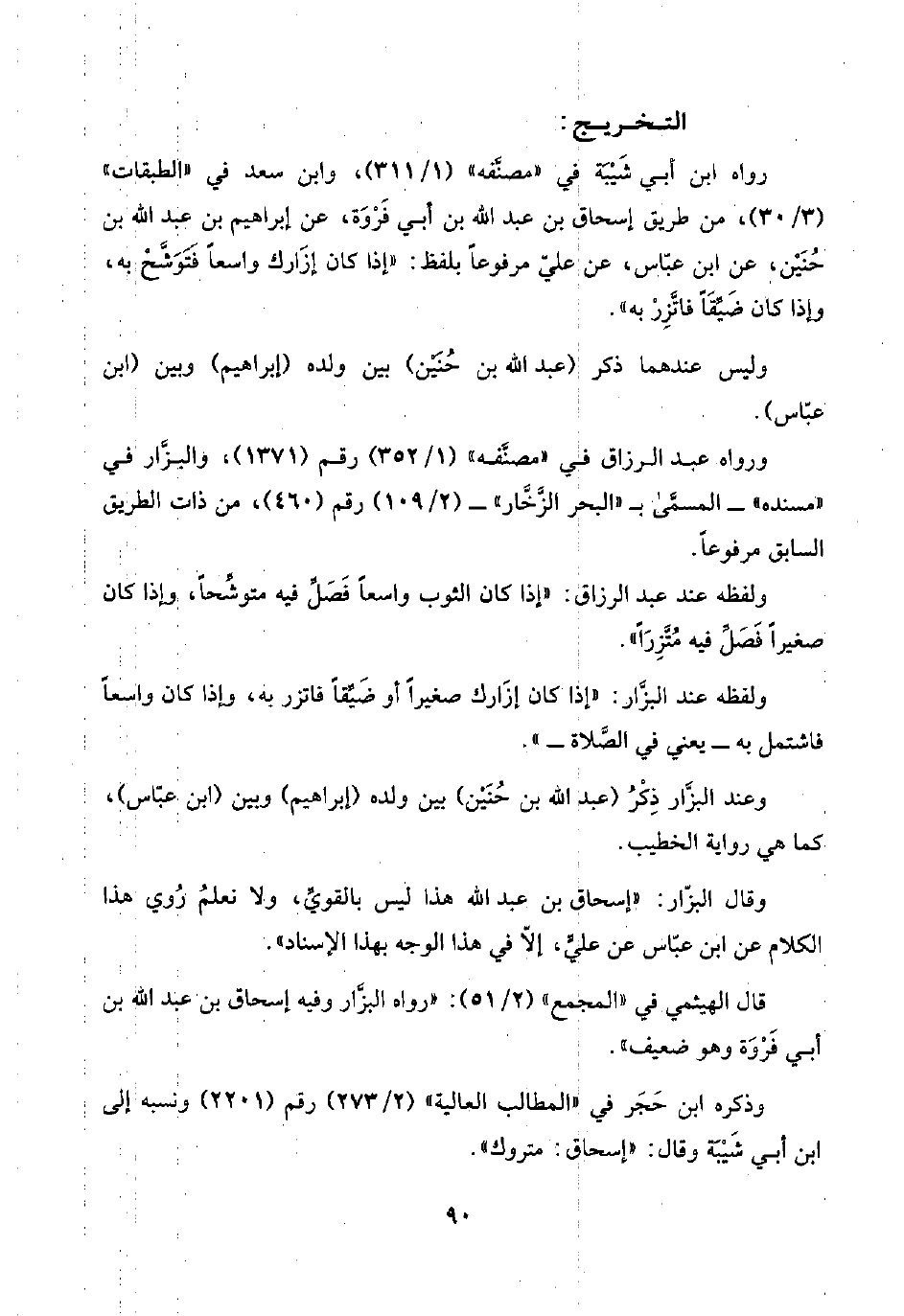 رواه ابن أبي شَيْبَة في "مصنَّفه" (١/ ٣١١)، وابن سعد في "الطبقات" (٣/ ٣٠)، من طريق إسحاق بن عبد اللَّه بن أبي فَرْوَة، عن إبراهيم بن عبد اللَّه بن حُنَيْن، عن ابن عبّاس، عن عليّ مرفوعًا بلفظ: "إذا كان إزَارك واسعًا فَتَوَشَّحْ به، وإذا كان ضَيِّقًا فاتَّزِرْ به".