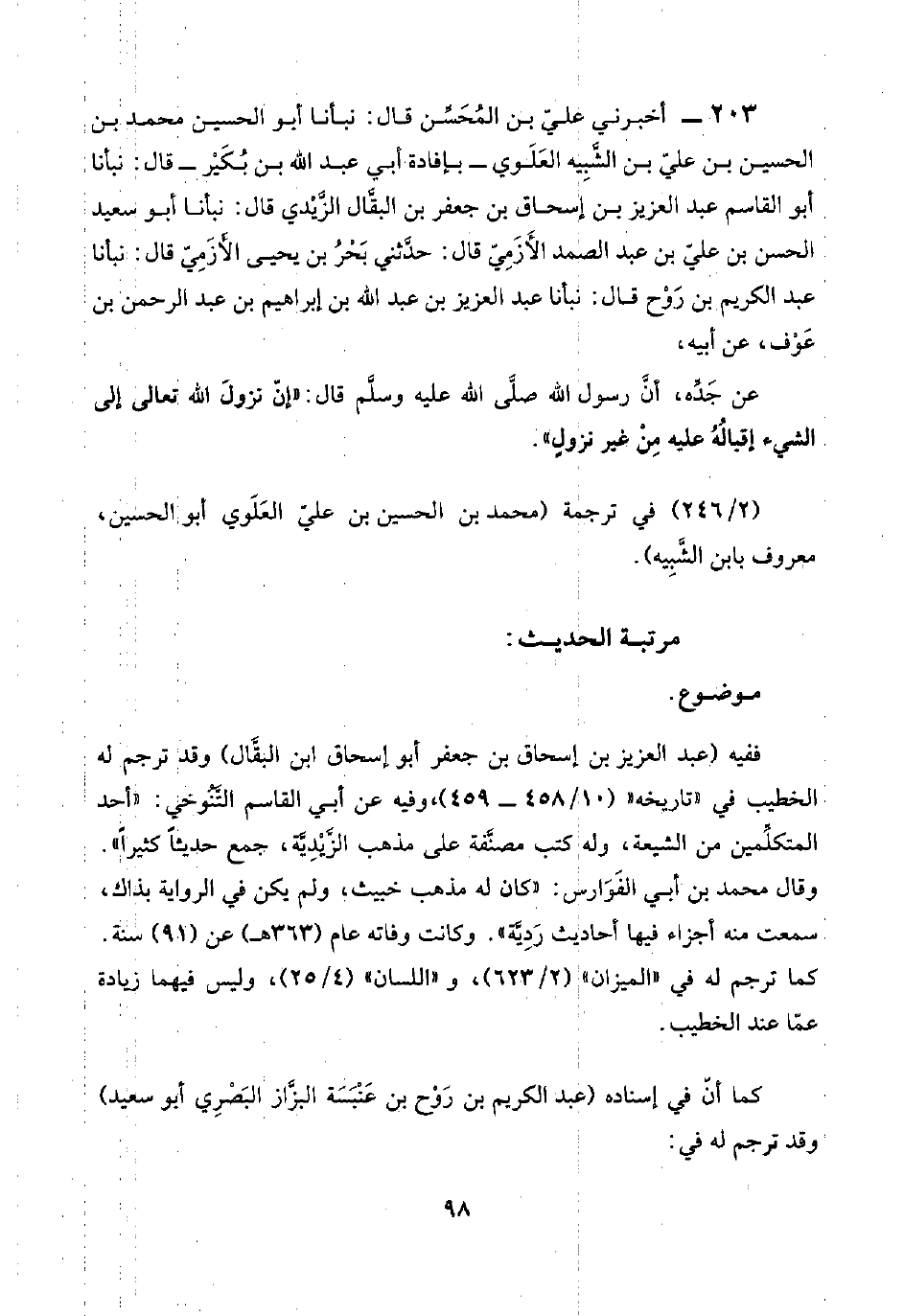 ٢٠٣ - أخبرني عليّ بن المُحَسِّن قال: نبأنا أبو الحسين محمد بن الحسين بن عليّ بن الشَّبِيه العَلَوي -بإفادة أبي عبد اللَّه بن بُكَيْر- قال: نبأنا أبو القاسم عبد العزيز بن إسحاق بن جعفر بن البقَّال الزَّيْدي قال: نبأنا أبو سعيد الحسن بن عليّ بن عبد الصمد الأَزَمِيّ قال: حدَّثني بَحْرُ بن يحيى الأَزَمِيّ قال: نبأنا عبد الكريم بن رَوْح قال: نبأنا عبد العزيز بن عبد اللَّه بن إبراهيم بن عبد الرحمن بن عَوْف، عن أبيه،