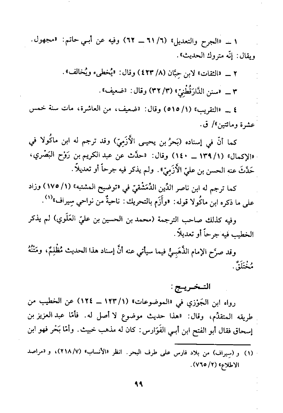 ١ - "الجرح والتعديل" (٦/ ٦١ - ٦٢) وفيه عن أبي حاتم: "مجهول. ويقال: إنّه متروك الحديث".