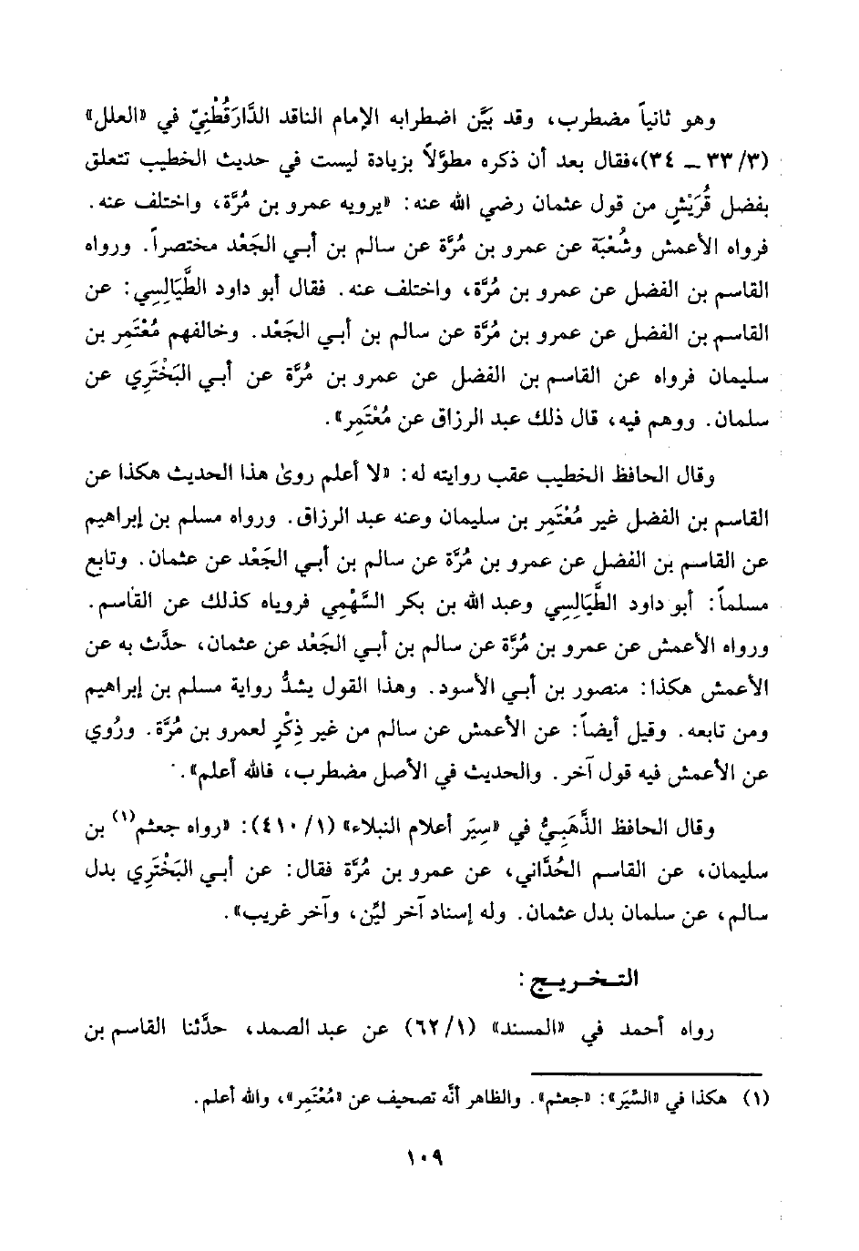 وقال الحافظ الخطيب عقب روايته له: "لا أعلم روى هذا الحديث هكذا عن القاسم بن الفضل غير مُعْتَمِر بن سليمان وعنه عبد الرزاق. ورواه مسلم بن إبراهيم عن القاسم بن الفضل عن عمرو بن مُرَّة عن سالم بن أبي الجَعْد عن عثمان. وتابع مَسْلَمَة: أبو داود الطَّيَالِسِي وعبد اللَّه بن بكر السَّهْمِي فروياه كذلك عن القاسم. ورواه الأعمش عن عمرو بن مُرَّة عن سالم بن أبي الجَعْد عن عثمان، حدَّث به عن الأعمش هكذا: منصور بن أبي الأسود. وهذا القول يشدُّ رواية مسلم بن إبراهيم ومن تابعه. وقيل أيضًا: عن الأعمش عن سالم من غير ذِكْرٍ لعمرو بن مُرَّة. ورُوي عن الأعمش فيه قول آخر. والحديث في الأصل مضطرب، فاللَّه أعلم".
