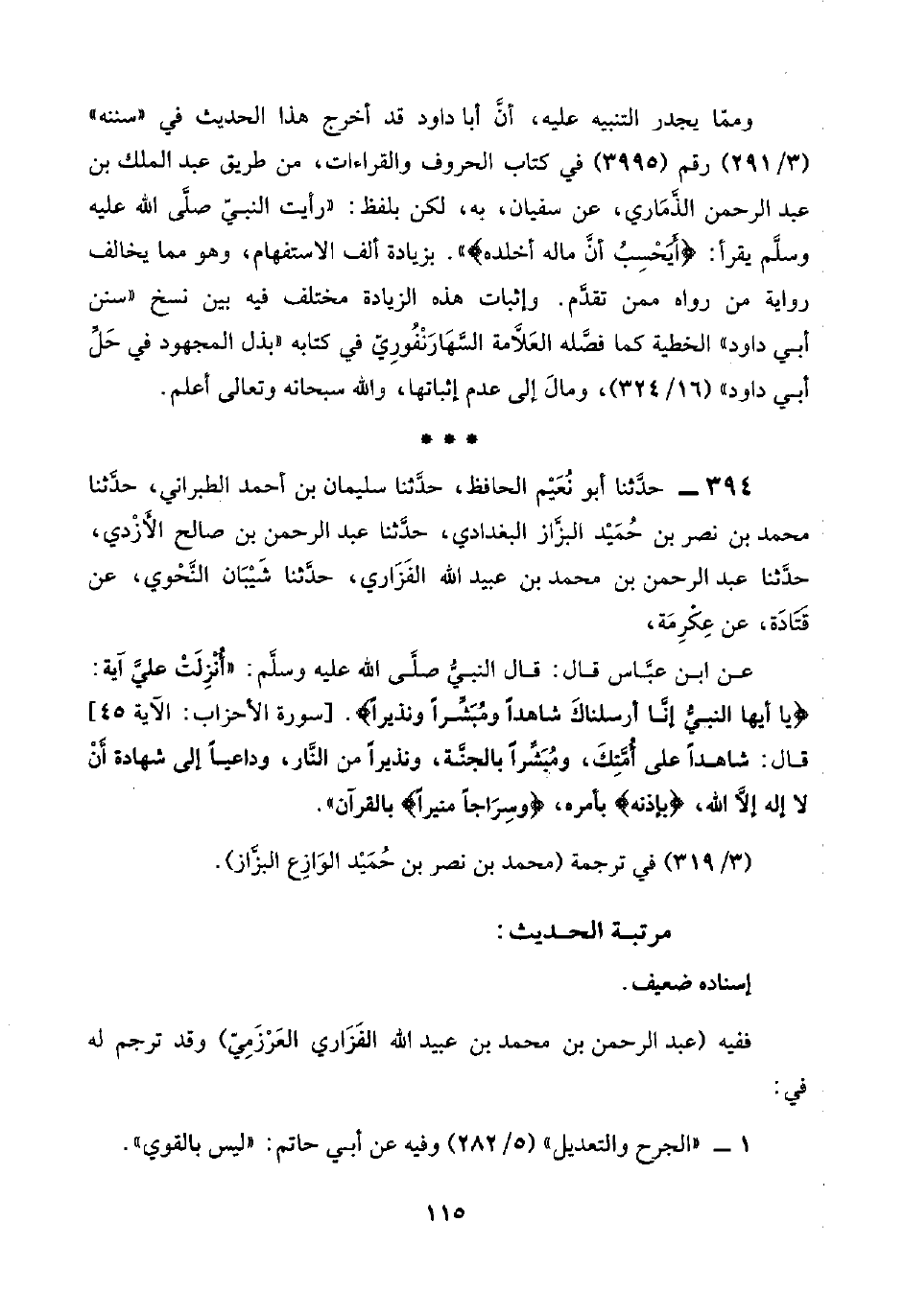 ٣٩٤ - حدَّثنا أبو نُعَيْم الحافظ، حدَّثنا سليمان بن أحمد الطبراني، حدَّثنا محمد بن نصر بن حُمَيْد البزَّاز البغدادي، حدَّثنا عبد الرحمن بن صالح الأَزْدِيّ، حدَّثنا عبد الرحمن بن محمد بن عبيد اللَّه الفَزَاري، حدَّثنا شَيْبَان النَّحْوي، عن قَتَادَة، عن عِكْرِمَة،