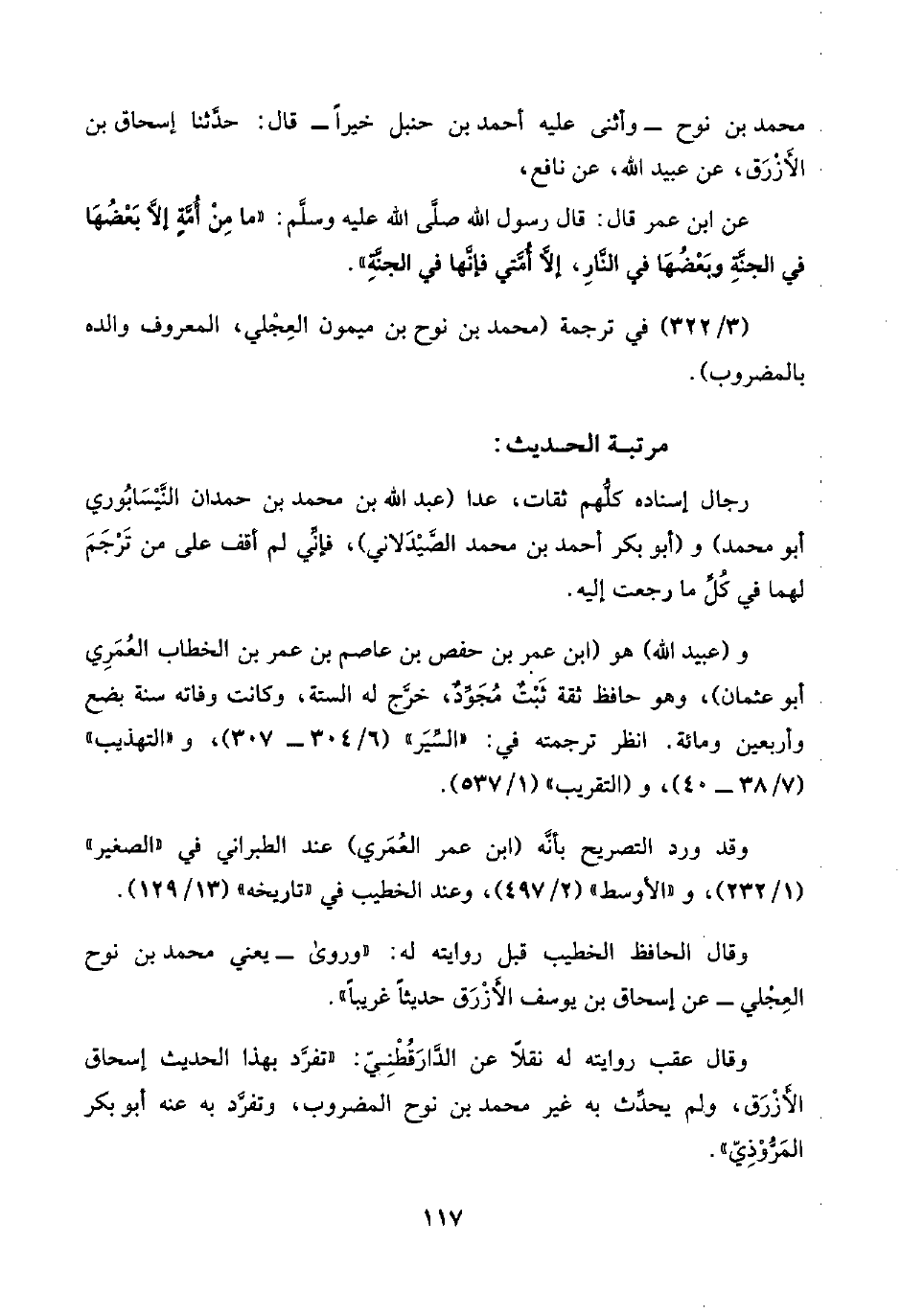 محمد بن نوح -وأثنى عليه أحمد بن حنبل خيرًا- قال: حدَّثنا إسحاق بن الأَزْرَق، عن عبيد اللَّه، عن نافع،