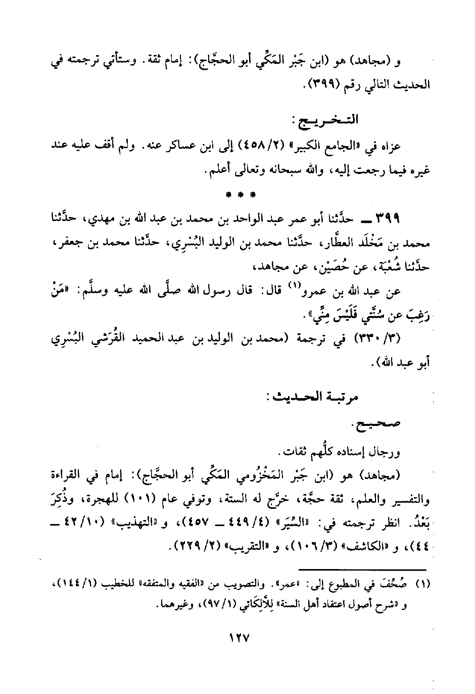 ٣٩٩ - حدَّثنا أبو عمر عبد الواحد بن محمد بن عبد اللَّه بن مهدي، حدَّثنا محمد بن مَخْلَد العطَّار، حدَّثنا محمد بن الوليد البُسْرِي، حدَّثنا محمد بن جعفر، حدَّثنا شُعْبَة، عن حُصَيْن، عن مجاهد،