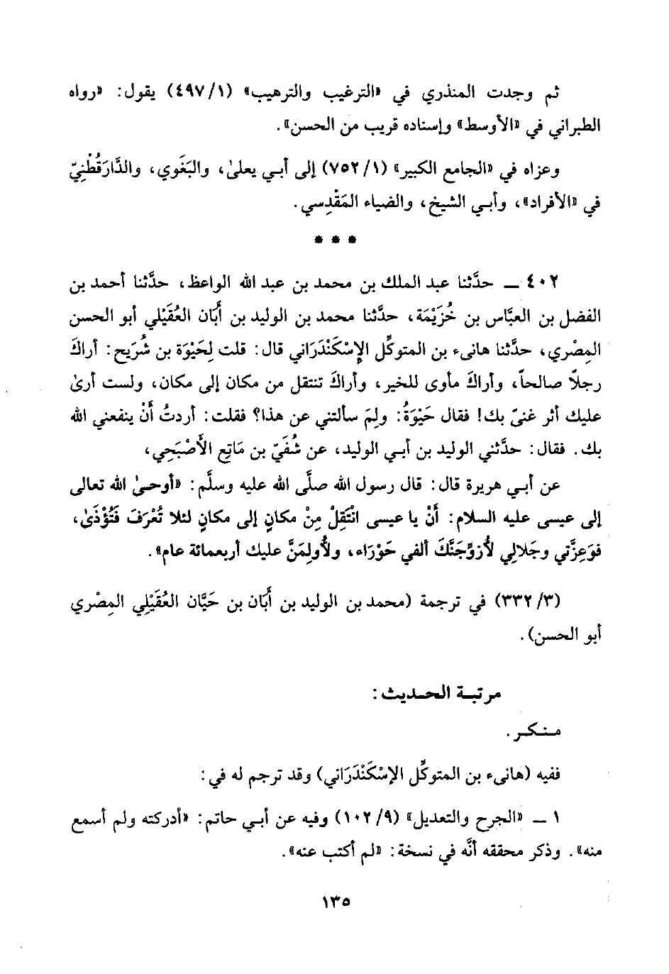 ٤٠٢ - حدَّثنا عبد الملك بن محمد بن عبد اللَّه الواعظ، حدَّثنا أحمد بن الفضل بن العبَّاس بن خُزَيْمَة، حدَّثنا محمد بن الوليد بن أَبَان العُقَيْلي أبو الحسن المِصْري، حدَّثنا هانئ بن المتوكِّل الإِسْكَنْدَرَاني قال: قلت لِحَيْوَة بن شُرَيح: أراكَ رجلًا صالحًا، وأراكَ مأوى للخير، وأراكَ تنتقل من مكان إلى مكان، ولست أرى عليك أثر غنًى بك! فقال حَيْوَةُ: ولِمَ سألتني عن هذا؟ فقلت: أردتُ أَنْ ينفعني اللَّه بك. فقال: حدَّثني الوليد بن أبي الوليد، عن شُفَيّ بن مَاتِع الأَصْبَحِي،