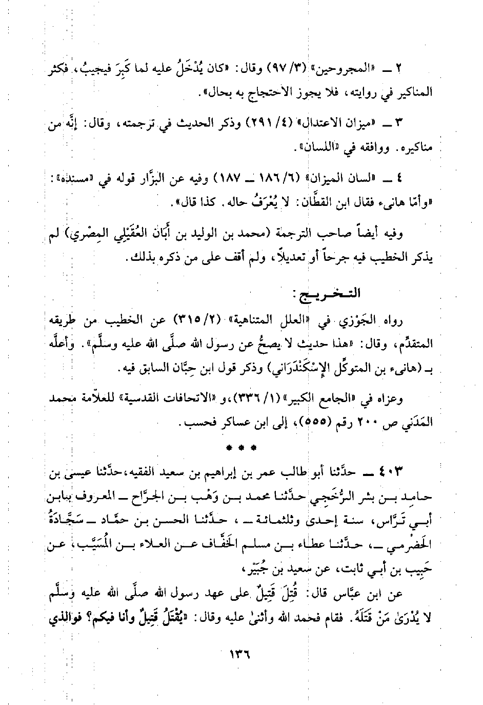 ٤٠٣ - حدَّثنا أبو طالب عمر بن إبراهيم بن سعيد الفقيه، حدَّثنا عيسى بن حماد بن بشر الرُّخَجِي حدَّثنا محمد بن وَهْب بن الجرَّاح -المعروف بابن أبي تَرَّاس، سنة إحدى وثلثمائة-، حدَّثنا الحسن بن حمَّاد -سَجَّادَةُ الحَضْرمي-، حدَّثنا عطاء بن مسلم الخَفَّاف عن العلاء بن المُسَيَّب، عن حَبِيب بن أبي ثابت، عن سعيد بن جُبَيْر،