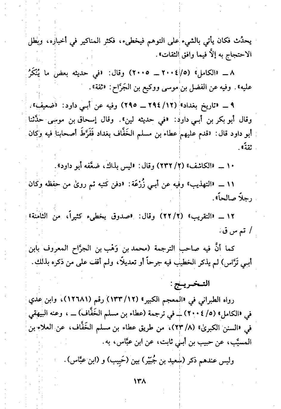 ٩ - "تاريخ بغداد" (١٢/ ٢٩٤ - ٢٩٥) وفيه عن أبي داود: "ضعيف". وقال أبو بكر بن أبي داود: "في حديثه لين". وقال إسحاق بن موسى: حدَّثنا أبو داود قال: "قدم عليهم عطاء بن مسلم الخَفَّاف بغداد فَفَرَّط أصحابنا فيه وكان ثقةً".