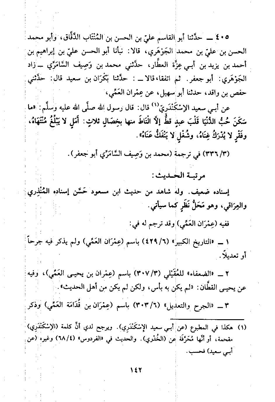 ٤٠٥ - حدَّثنا أبو القاسم عليّ بن الحسن بن المُنْتَاب الدَّقَّاق، وأبو محمد الحسن بن عليّ بن محمد الجَوْهَري، قالا: نبأنا أبو الحسن عليّ بن إبراهيم بن أحمد بن يزيد بن أبي عِزَّة العطَّار، حدَّثني محمد بن وَصِيف السَّامَرِّي -زاد الجَوْهَري: أبو جعفر. ثم اتفقا، قالا-: حدَّثنا بَكْرَان بن سعيد قال: حدَّثني حفص بن واقد، حدَّثنا أبو سهيل، عن عِمْران العَمِّي،
