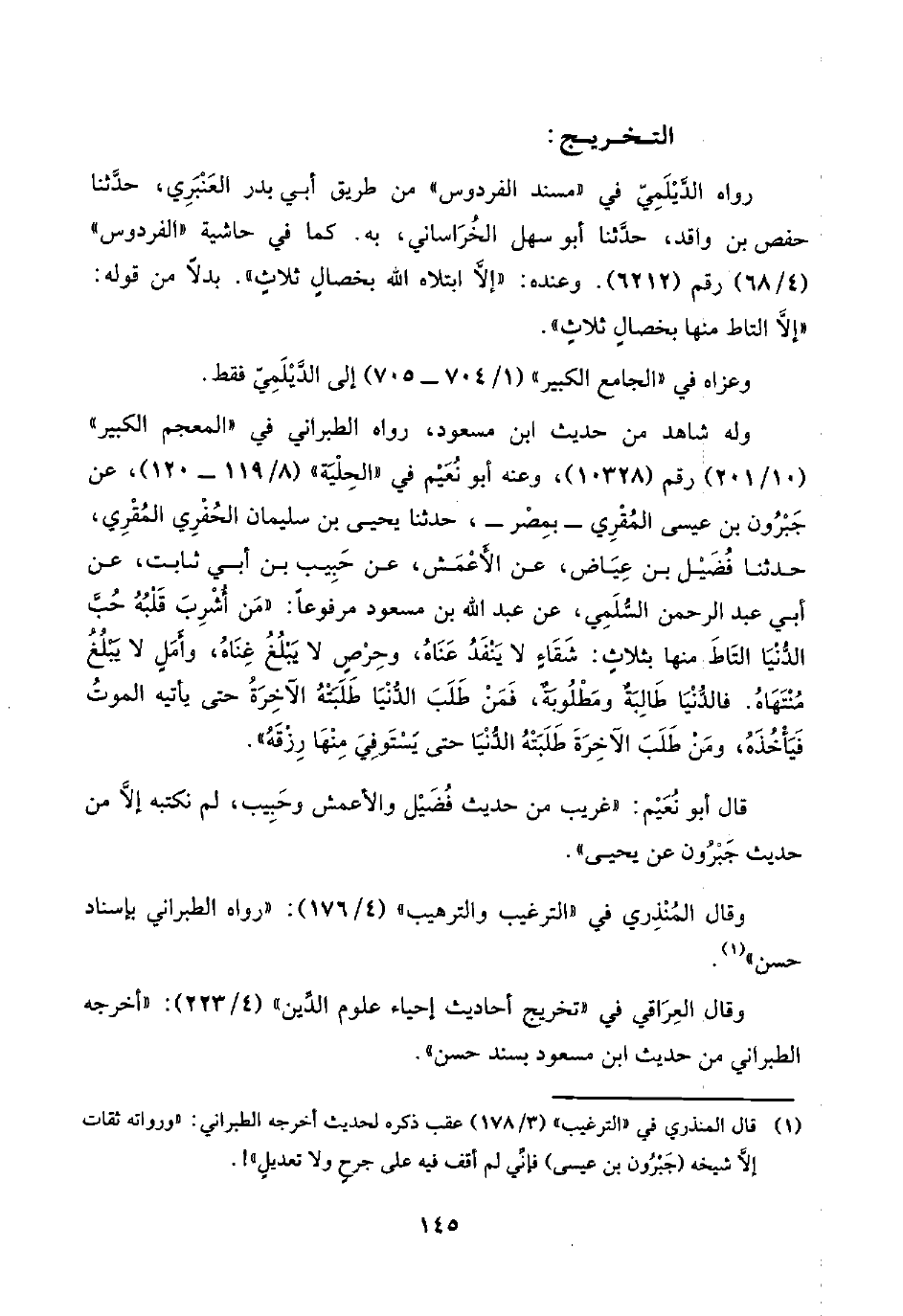 وقال العِرَاقي في "تخريج أحاديث إحياء علوم الدِّين" (٤/ ٢٢٣): "أخرجه الطبراني من حديث ابن مسعود بسند حسن".