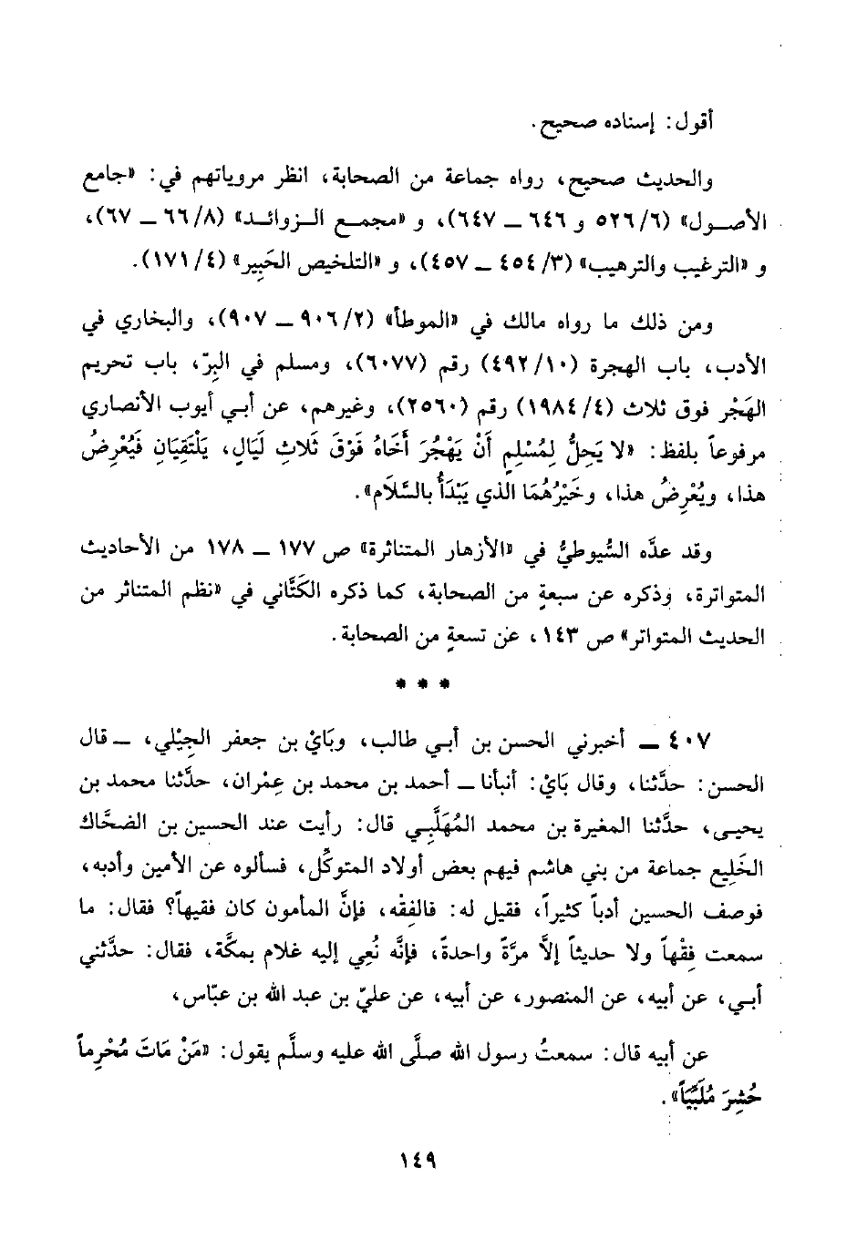 ومن ذلك ما رواه مالك في "الموطأ" (٢/ ٩٠٦ - ٩٠٧)، والبخاري في الأدب، باب الهجرة (١٠/ ٤٩٢) رقم (٢٥٦٠)، ومسلم في البِرّ، باب تحريم الهَجْر فوق ثلاث (٤/ ١٩٨٤) رقم (٢٥٦٠)، وغيرهم، عن أبي أيوب الأنصاري مرفوعًا بلفظ: "لا يَحِلُّ لِمُسْلِمٍ أَنْ يَهْجُرَ أَخَاهُ فَوْقَ ثَلاثِ لَيَالٍ، يَلْتَقِيَانِ فَيْعُرِضُ هذا، ويُعْرِضُ هذا، وخَيْرُهُمَا الذي يَبْدَأُ بالسَّلَام".