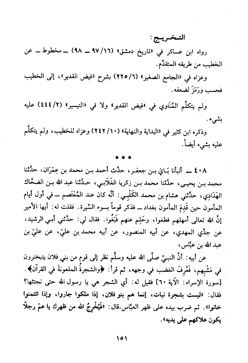 ٤٠٨ - أنبأنا بَايْ بن جعفر، حدَّث أحمد بن محمد بن عِمْران، حدَّثنا محمد بن يحيى، حدَّثنا محمد بن زكريا الغَلَابي، حدَّثنا عبد اللَّه بن الضحَّاك الهَدَادِي، حدَّثني هشام بن محمد الكَلْبِي: أنَّه كان عند المُعْتَصم -في أول أيَّام المأمون حين قَدِمَ المأمون بغداد- فذكر قومًا بسوء السِّيرة. فقلت له: أيها الأمير إنَّ اللَّه تعالى أمهلهم فطغوا، وحَلِم عنهم فَبَغُوا. فقال لي: حدَّثني أبي الرشيد، عن جدِّي المهدي، عن أبيه المنصور، عن أبيه محمد بن عليّ، عن عليّ بن عبد اللَّه بن عبَّاس،
