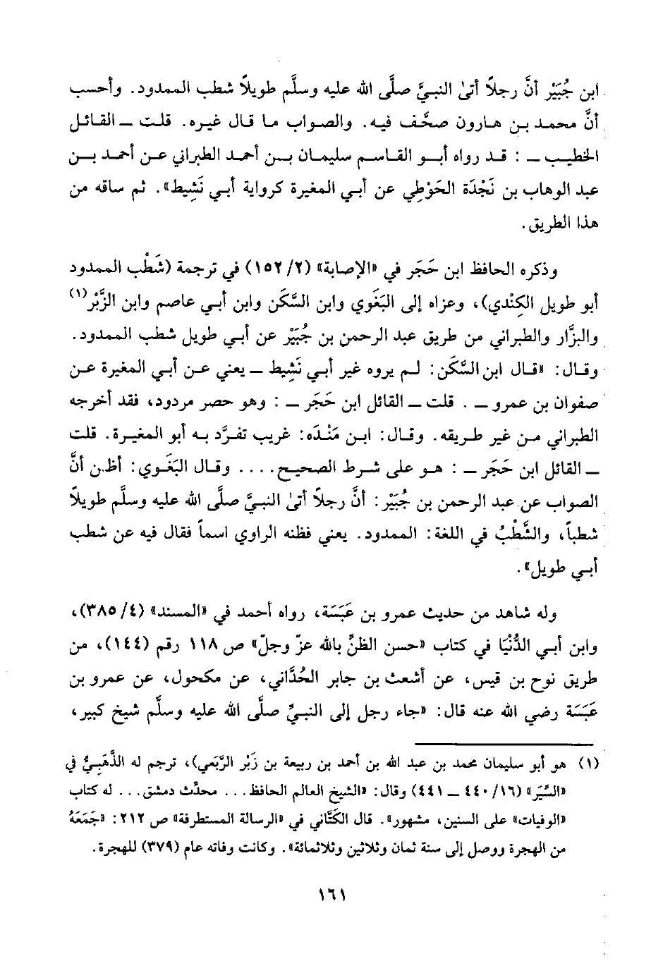 ابن جُبَيْر أنَّ رجلًا أتى النبيَّ صلَّى اللَّه عليه وسلَّم طويلًا شطب الممدود. وأحسب أنَّ محمد بن هارون صحَّف فيه، والصَّواب ما قال غيره. قلت -القائل الخطيب-: قد رواه أبو القاسم سليمان بن أحمد الطبراني عن أحمد بن عبد الوهاب بن نَجْدَة الحَوْطِي عن أبي المغيرة كرواية أبي نَشِيط". ثم ساقه من هذا الطريق.