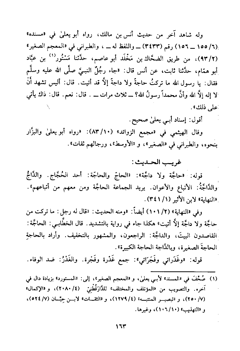 وفي "النهاية" (٢/ ١٠١) أيضًا: "ومنه الحديث: "قال له رجل: ما تركت من حاجَّة ولا داجَّة إلَّا أتيت" هكذا جاء في رواية بالتشديد. قال الخطَّابي: الحاجَّة: القاصدون البيتَ، والداجَّة: الراجعون، والمشهور بالتخفيف. وأراد بالحاجةِ الحاجَة الصغيرة، وبالدَّاجة الحاجة الكبيرة".