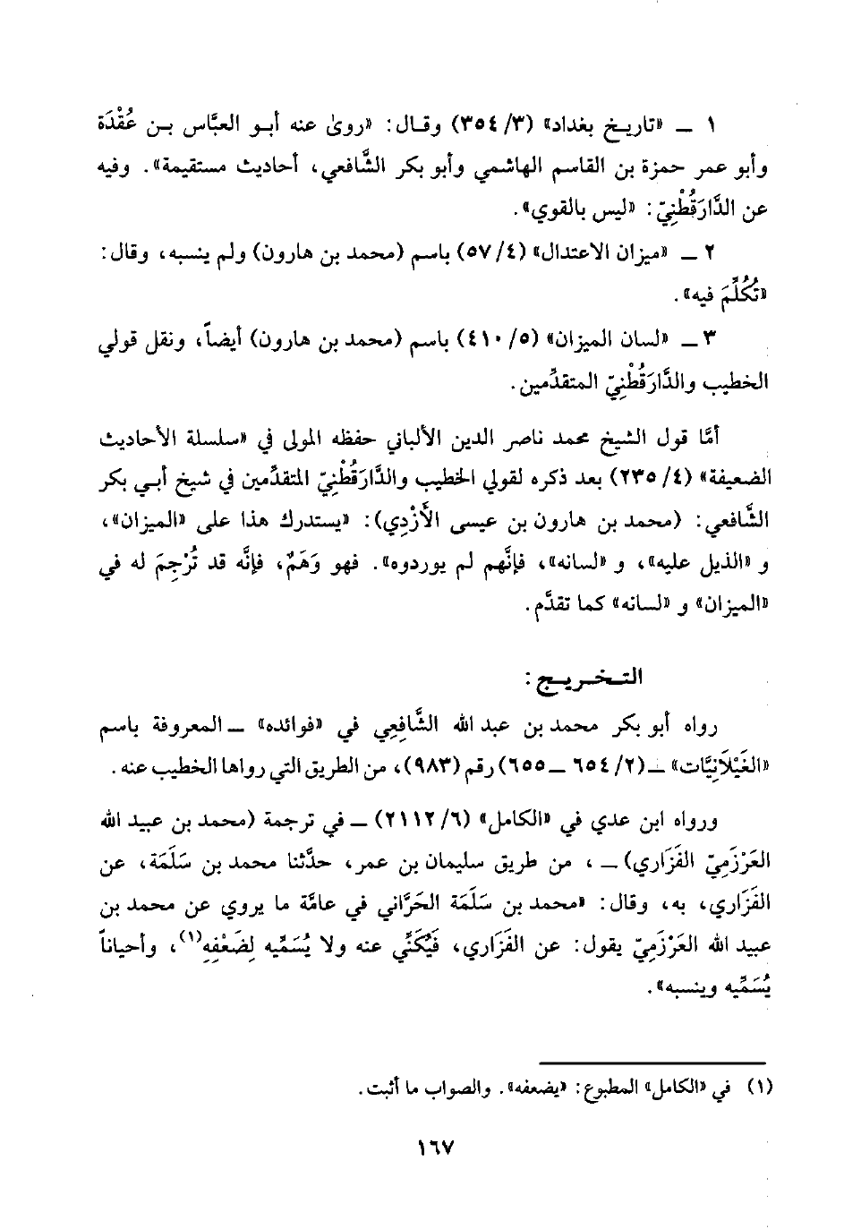 أمَّا قول الشيخ محمد ناصر الدين الألباني حفظه المولى في "سلسلة الأحاديث الضعيفة" (٤/ ٢٣٥) بعد ذكره لقولي الخطيب والدَّارَقُطْنِيّ المتقدِّمين في شيخ أبي بكر الشافعي: (محمد بن هارون بن عيسى الأَزْدي): "يستدرك هذا على "الميزان"، و"الذيل عليه"، و"لسانه"، فإنَّهم لم يوردوه". فهو وَهَمٌ، فإنَّه قد تُرْجِمَ له في الميزان" و"لسانه" كما تقدَّم.
