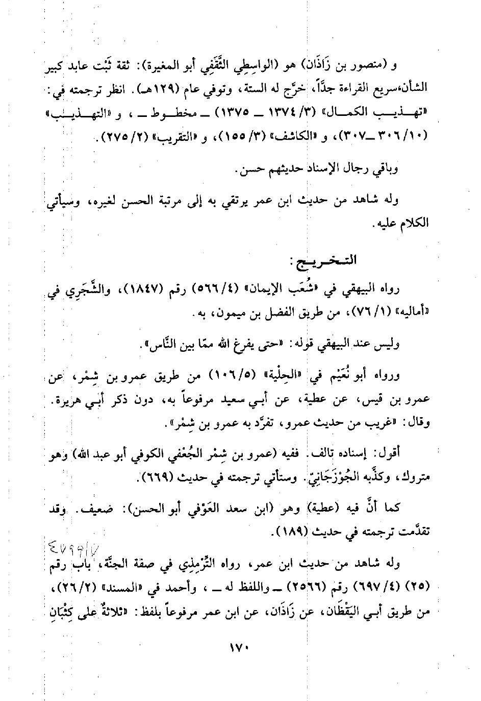 و (منصور بن زَاذَان) هو (الوَاسِطي الثَّقَفِي أبو المغيرة): ثقة ثَبْت عابد كبير الشأن، سريع القراءة جدًّا، خرَّج له الستة، وتوفي عام (١٢٩ هـ). انظر ترجمته في: "تهذيب الكمال" (٣/ ١٣٧٤ - ١٣٧٥) -مخطوط-، و"التهذيب" (١٠/ ٣٠٦ - ٣٠٧)، و"الكاشف" (٣/ ١٥٥)، و"التقريب" (٢/ ٢٧٥).