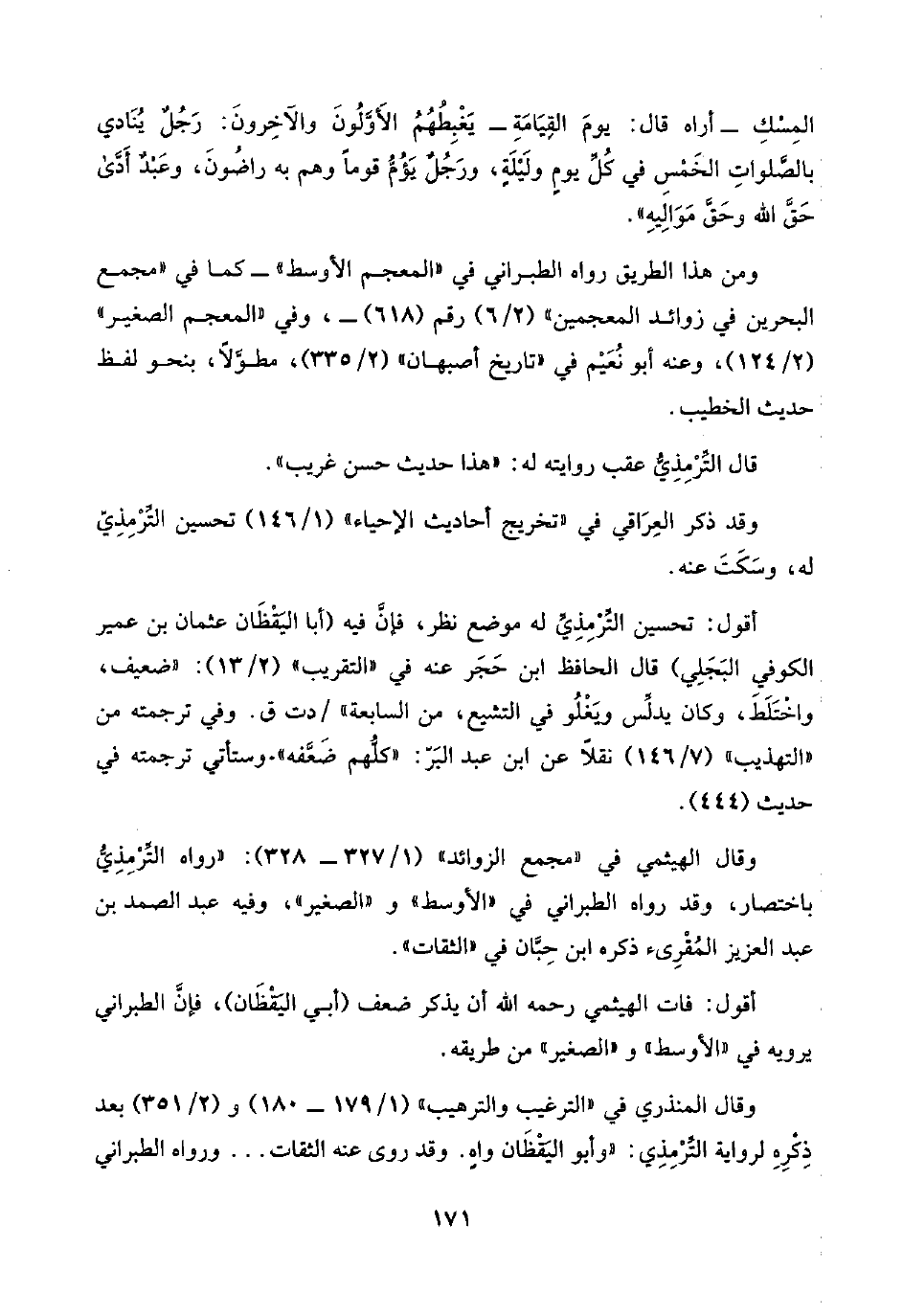 وقال الهيثمي في "مجمع الزوائد" (١/ ٣٢٧ - ٣٢٨): "رواه التِّرْمِذِيُّ باختصار، وقد رواه الطبراني في "الأوسط" و"الصغير"، وفيه عبد الصمد بن عبد العزيز المُقْرِئ ذكره ابن حِبَّان في "الثقات".