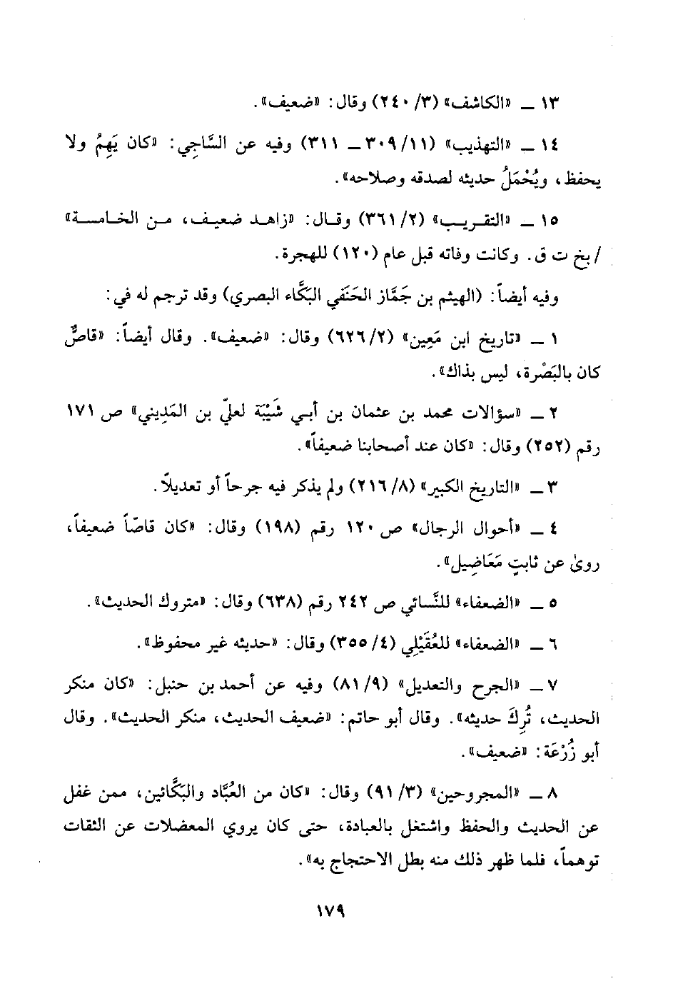٨ - "المجروحين" (٣/ ٩١) وقال: "كان من العُبَّاد والبَكَّائين، ممن غفل عن الحديث والحفظ واشتغل بالعبادة، حتى كان يروي المعضلات عن الثقات توهمًا، فلما ظهر ذلك منه بطل الاحتجاج به".