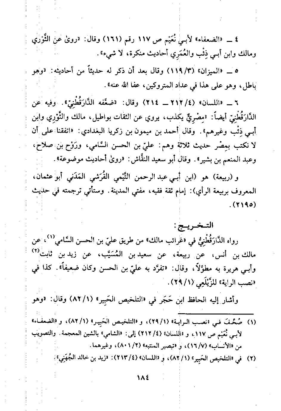 ٦ - "اللسان" (٤/ ٢١٢ - ٢١٤) وقال: "ضعَّفه الدَّارَقُطْنِيّ". وفيه عن الدَّارَقُطْنِيّ أيضًا: "مِصْرِيٌّ يكذب، يروي عن الثقات بواطيل، مالك والثَّوْرِي وابن أبي ذِئْب وغيرهم". وقال أحمد بن ميمون بن زكريا البغدادي: "اتفقنا على أن لا نكتب بمِصْر حديث ثلاثة وهم: عليّ بن الحسن السَّامي، ورَوْح بن صلاح، وعبد المنعم بن بشير". وقال أبو سعيد النقَّاش: "روى أحاديث موضوعة".
