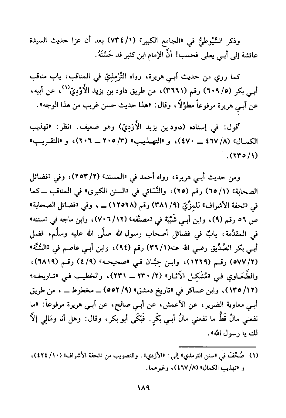 ومن حديث أبي هريرة، رواه أحمد في "المسند" (٢/ ٢٥٣)، وفي "فضائل الصحابة" (١/ ٦٥) رقم (٢٥)، والنَّسَائي في "السنن الكبرى" في المناقب -كما في "تحفة الأشراف" للمِزِّيّ (٩/ ٣٨١) رقم (١٢٥٢٨) -، وفي "فضائل الصحابة" ص ٥٦ رقم (٩)، وابن أبي شَيْبَة في "مصنَّفه" (١٢/ ٧٠٦)، وابن ماجه في "سننه" في المقدِّمة، بابٌ في فضائل أصحاب رسول اللَّه صلَّى اللَّه عليه وسلَّم، فضل أبي بكر الصِّدِّيق رضي اللَّه عنه (١/ ٣٦) رقم (٩٤)، وابن أبي عاصم في "السُّنَّة" (٢/ ٥٧٧) رقم (١٢٢٩)، وابن حِبَّان في "صحيحه" (٩/ ٤) رقم (٦٨١٩)، والطَّحَاوي في "مُشْكِل الآثار" (٢/ ٢٣٠ - ٢٣١)، والخطيب في "تاريخه" (١٢/ ١٣٥)، وابن عساكر في "تاريخ دمشق" (٩/ ٥٥٢) -مخطوط-، من طريق أبي معاوية الضرير، عن الأعمش، عن أبي صالح، عن أبي هريرة مرفوعًا: "ما نفعني مالٌ قَطُّ ما نفعني مالُ أبي بَكْر. فَبَكَي أبو بكر، وقال: وهل أنا ومَالي إلَّا لك يا رسول اللَّه".