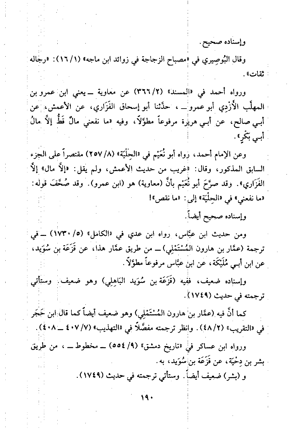 وعن الإمام أحمد، رواه أبو نُعَيْم في "الحِلْيَة" (٨/ ٢٥٧) مقتصرًا على الجزء السابق المذكور، وقال: "غريب من حديث الأعمش، ولم يقل: "إلَّا مال" إلَّا الفَزَاري". وقد صرَّحَ أبو نُعَيْم بأنَّ (معاوية) هو (ابن عمرو). وقد صُحَّفَ قوله: "ما نفعني" في "الحِلْيَة" إلى: "ما نقص"! .