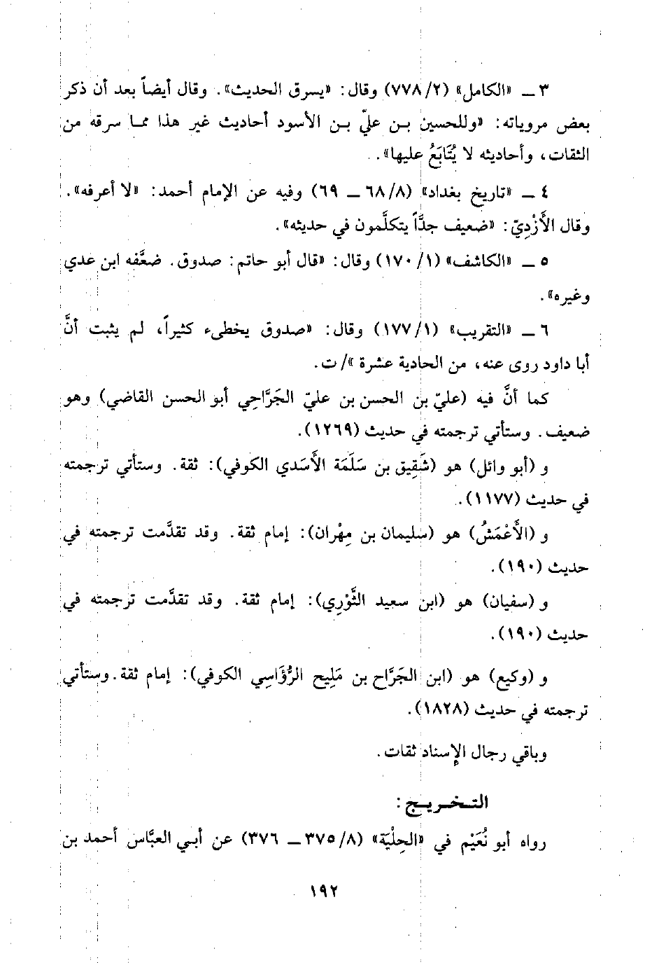 ٣ - "الكامل" (٢/ ٧٧٨) وقال: "يسرق الحديث". وقال أيضًا بعد أن ذكر بعض مروياته: "وللحسين بن عليّ بن الأسود أحاديث غير هذا مما سرقه من الثقات، وأحاديثه لا يُتَابَعُ عليها".