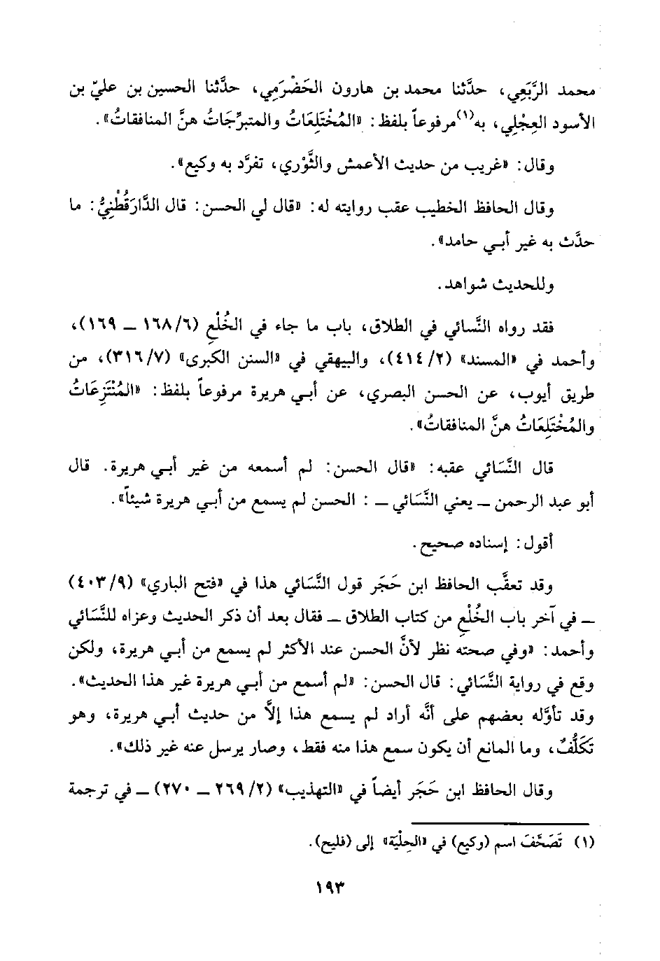 وقد تعقَّب الحافظ ابن حَجَر قول النَّسَائي هذا في "فتح الباري" (٩/ ٤٠٣) -في آخر باب الخُلْعِ من كتاب الطلاق- فقال بعد أن ذكر الحديث وعزاه للنَّسَائي وأحمد: "في صحته نظر لأنَّ الحسن عند الأكثر لم يسمع من أبي هريرة، ولكن وقع في رواية النَّسَائي: قال الحسن: "لم أسمع من أبي هريرة غير هذا الحديث". وقد تأوَّله بعضهم على أنَّه أراد لم يسمع هذا إلَّا من حديث أبي هريرة، وهو تَكَلُّفٌ، وما المانع أن يكون سمع هذا منه فقط، وصار يرسل عنه غير ذلك".