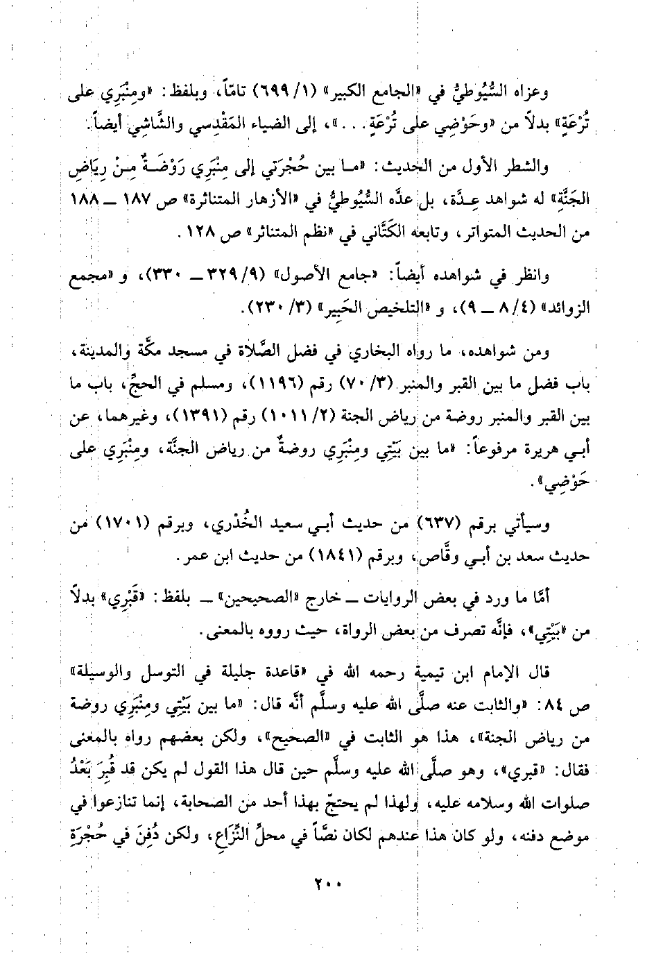 قال الإمام ابن تيمية رحمه اللَّه في "قاعدة جليلة في التوسل والوسيلة" ص ٨٤: "والثابت عنه صلَّى اللَّه عليه وسلَّم أنَّه قال: "ما بين بَيْتِي ومِنْبَرِي روضة من رياض الجنة"، هذا هو الثابت في "الصحيح"، ولكن بعضهم رواه بالمعنى فقال: "قبري"، وهو صلَّى اللَّه عليه وسلَّم حين قال هذا القول لم يكن قد قُبِرَ بَعْدُ صلوات اللَّه وسلامه عليه، ولهذا لم يحتجّ بهذا أحد من الصحابة، إنما تنازعوا في موضع دفنه، ولو كان هذا عندهم لكان نصًّا في محلِّ النِّزَاعِ، ولكن دُفِنَ في حُجْرَةِ