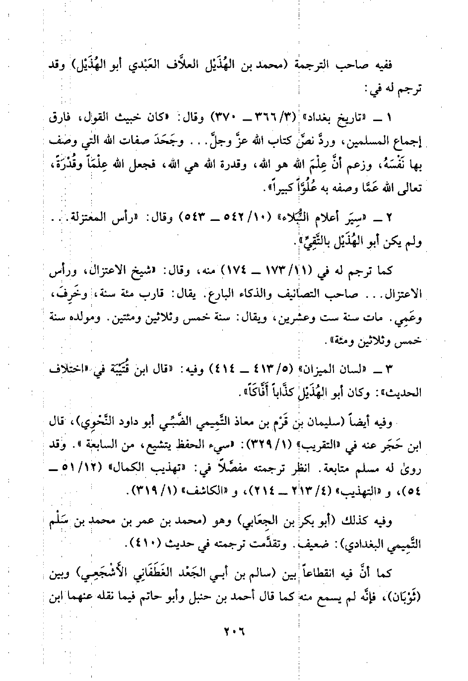٢ - "سِيَر أعلام النُّبَلاء" (١٠/ ٥٤٢ - ٥٤٣) وقال: "رأس المعتزلة. . . ولم يكن أبو الهُذَيْل بالتَّقِيِّ".